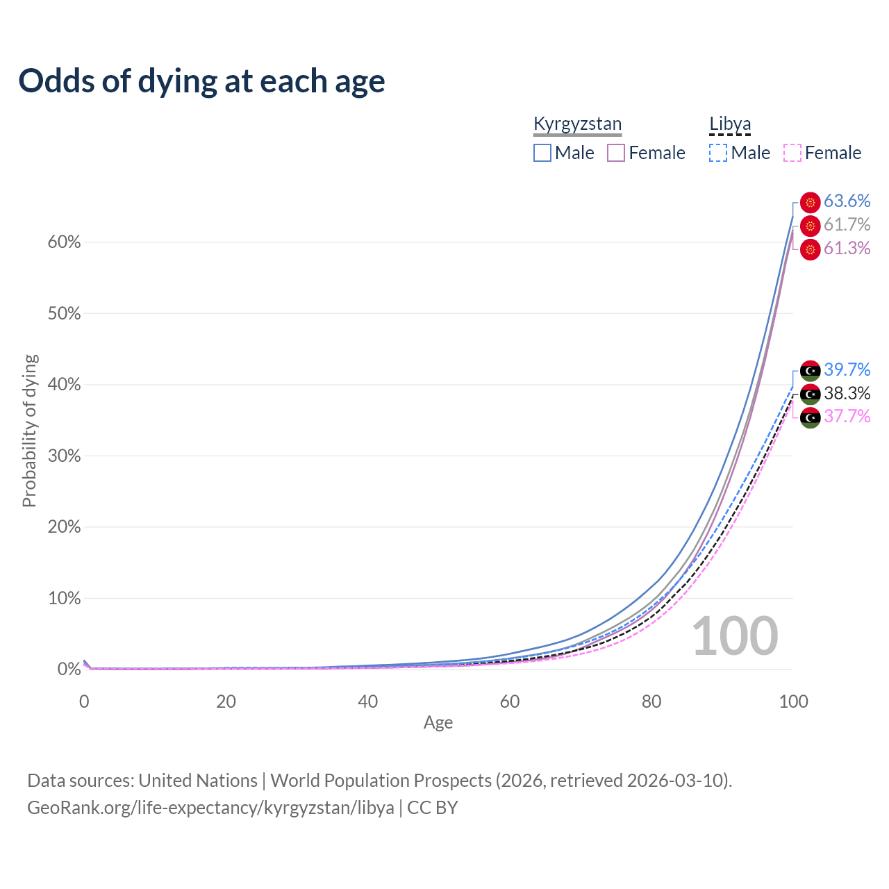 This life expectancy calculator shows the odds of living to 100, 95, 90, and below based on current age for both males and females in Kyrgyzstan and Libya, along with mean and median age of death. The calculations are based on the 2026 life tables (actuarial tables) from the UN World Population Prospects.