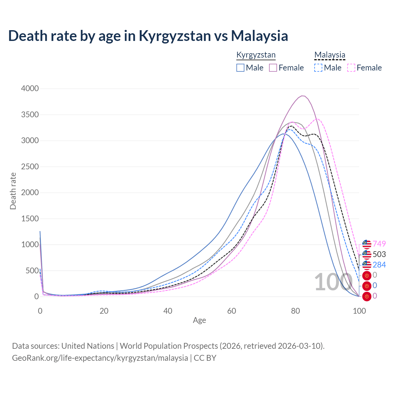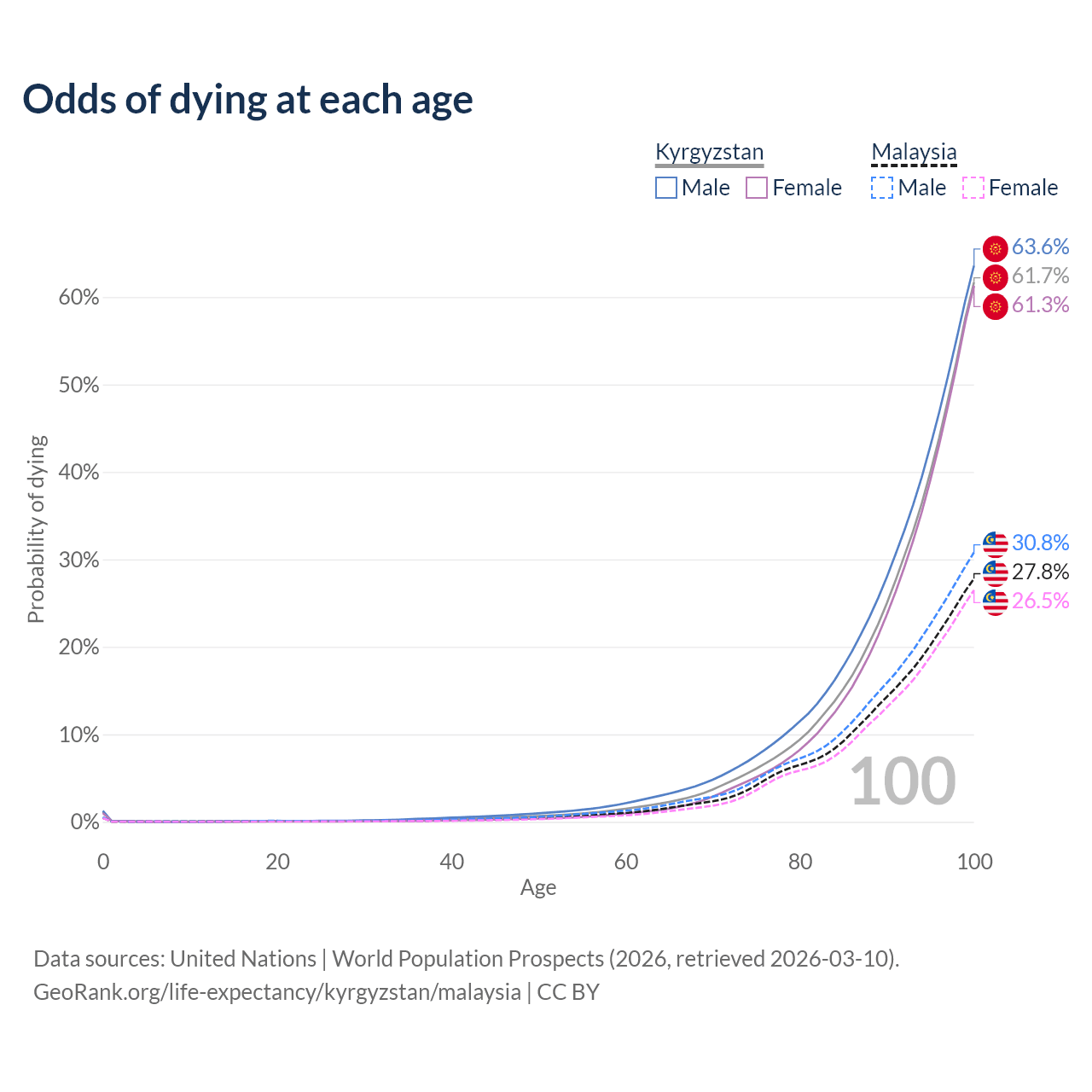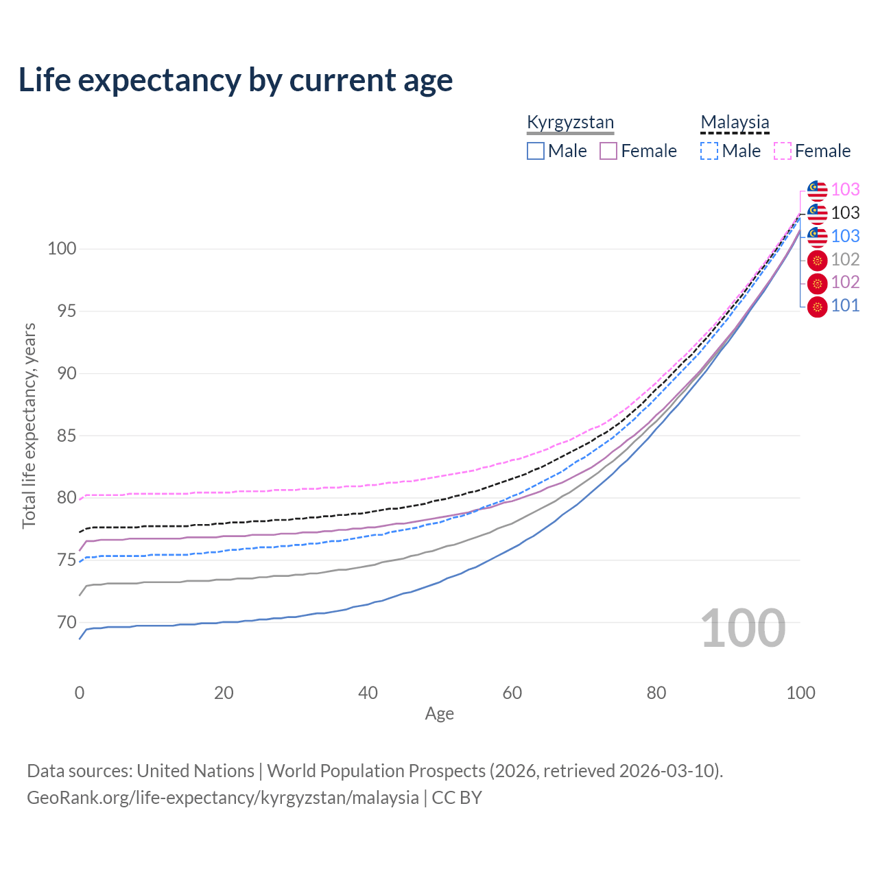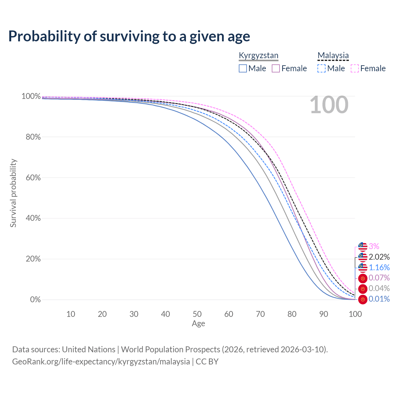 This life expectancy calculator shows the odds of living to 100, 95, 90, and below based on current age for both males and females in Kyrgyzstan and Malaysia, along with mean and median age of death. The calculations are based on the 2026 life tables (actuarial tables) from the UN World Population Prospects.
