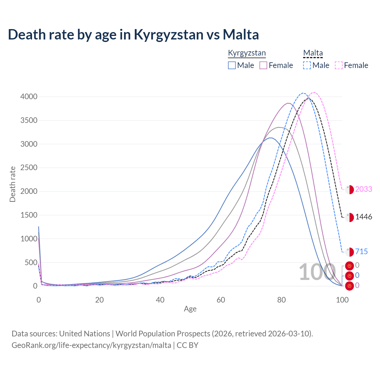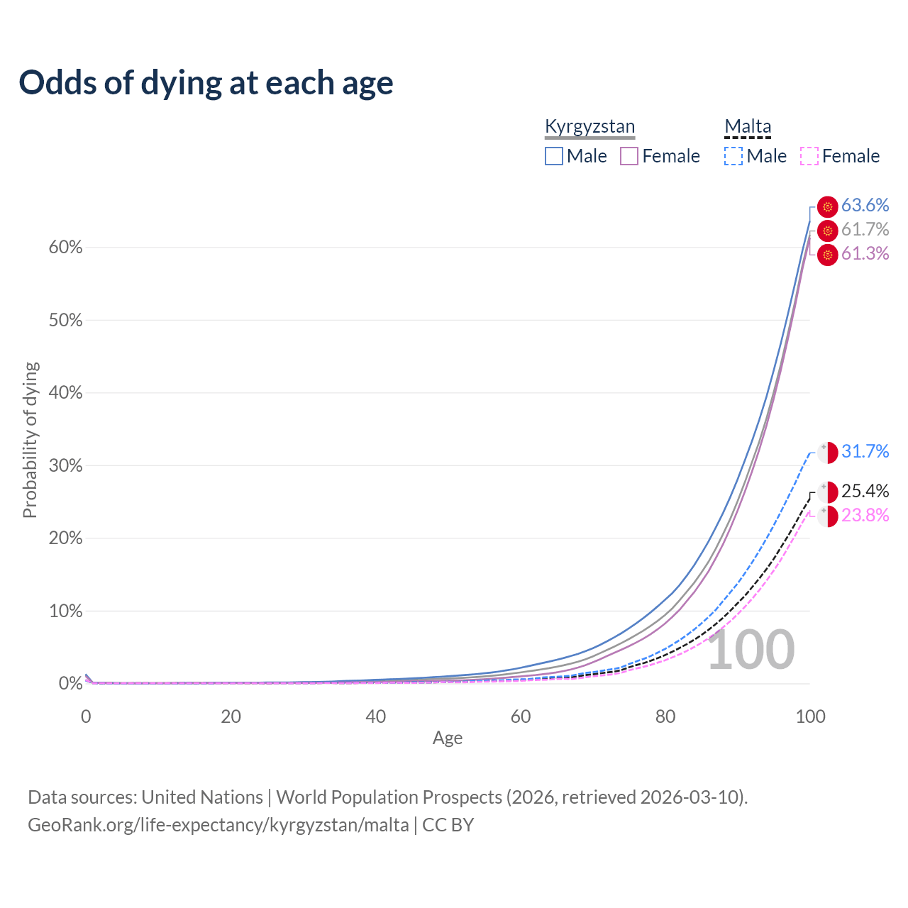 This life expectancy calculator shows the odds of living to 100, 95, 90, and below based on current age for both males and females in Kyrgyzstan and Malta, along with mean and median age of death. The calculations are based on the 2026 life tables (actuarial tables) from the UN World Population Prospects.