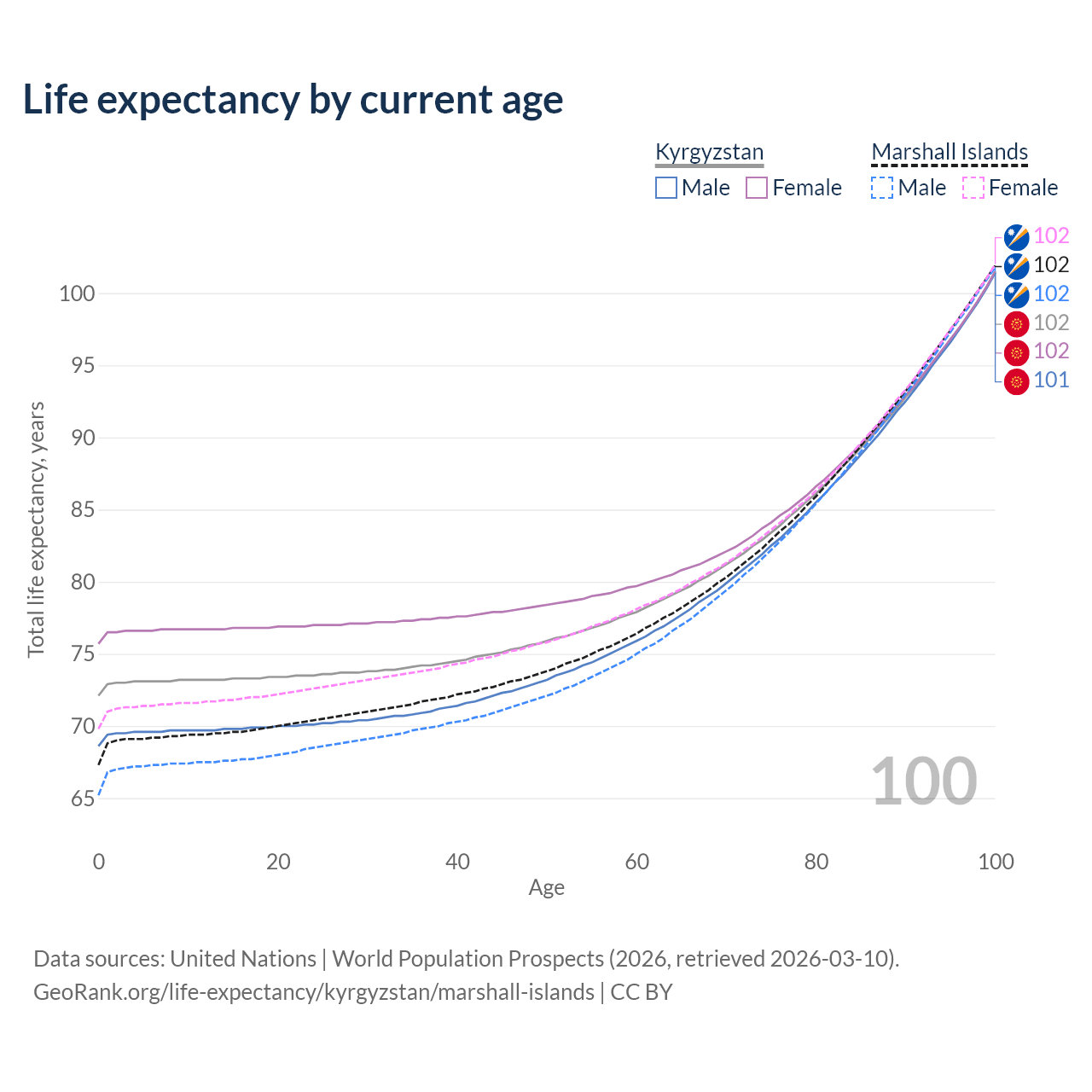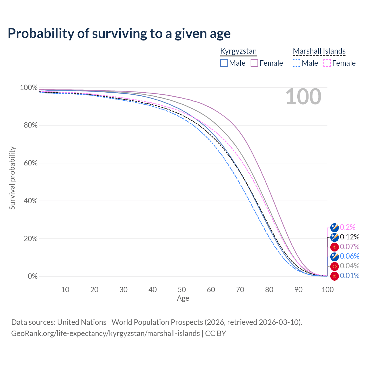 This life expectancy calculator shows the odds of living to 100, 95, 90, and below based on current age for both males and females in Kyrgyzstan and the Marshall Islands, along with mean and median age of death. The calculations are based on the 2026 life tables (actuarial tables) from the UN World Population Prospects.