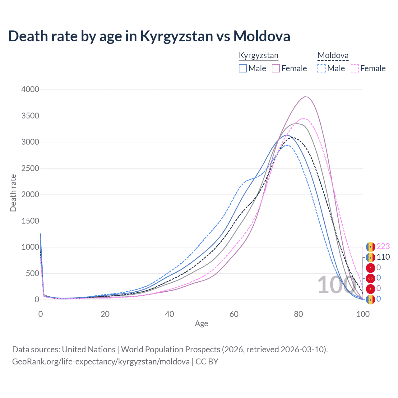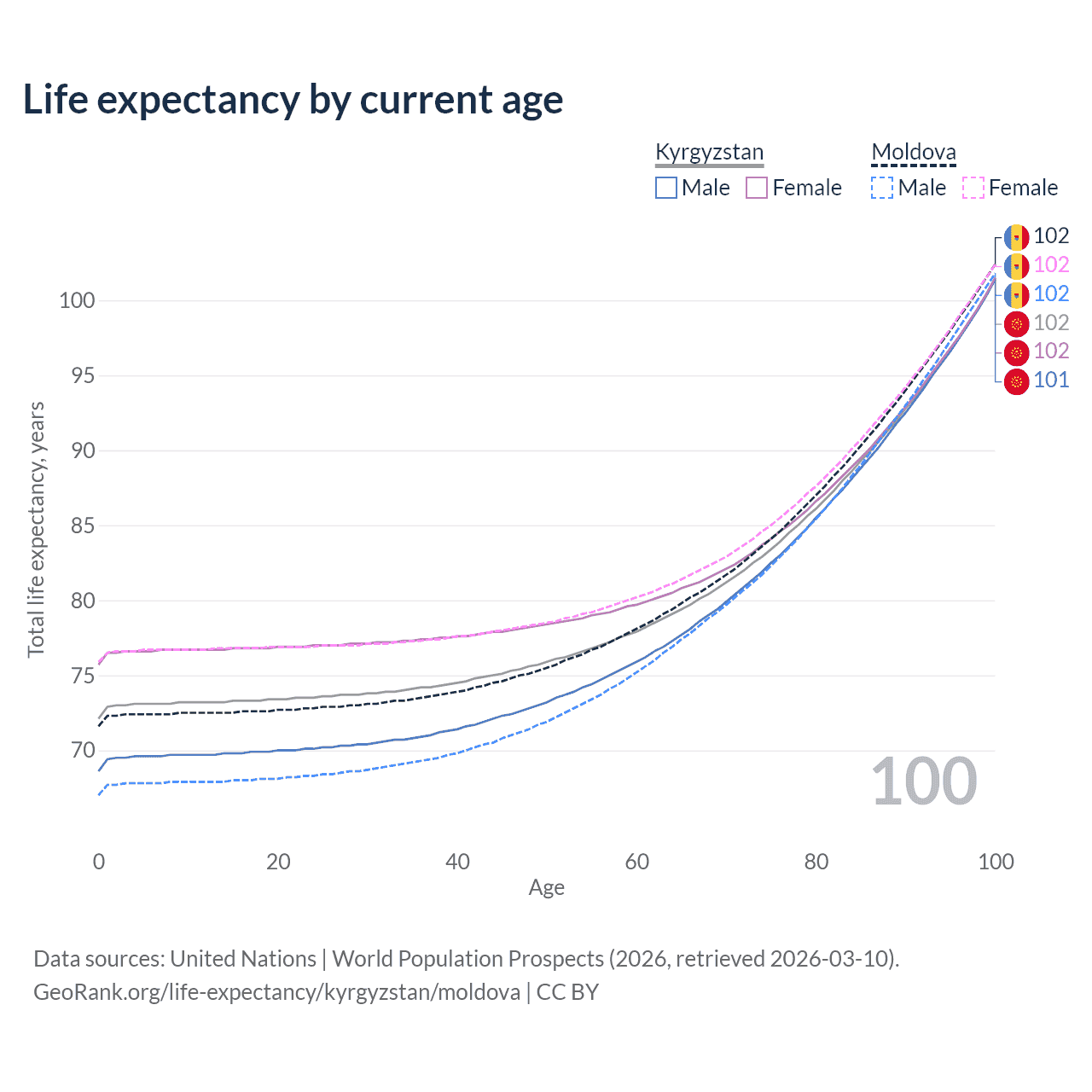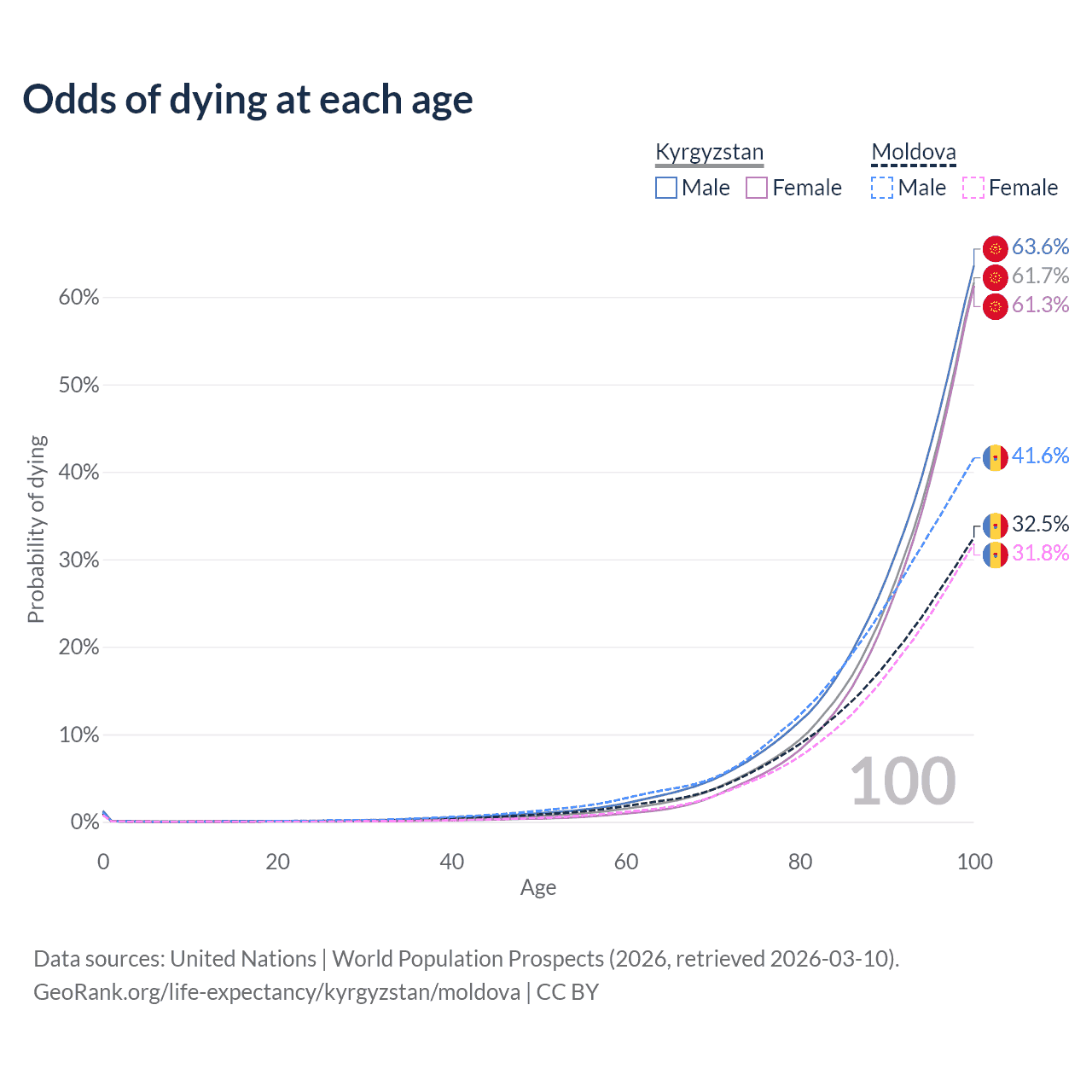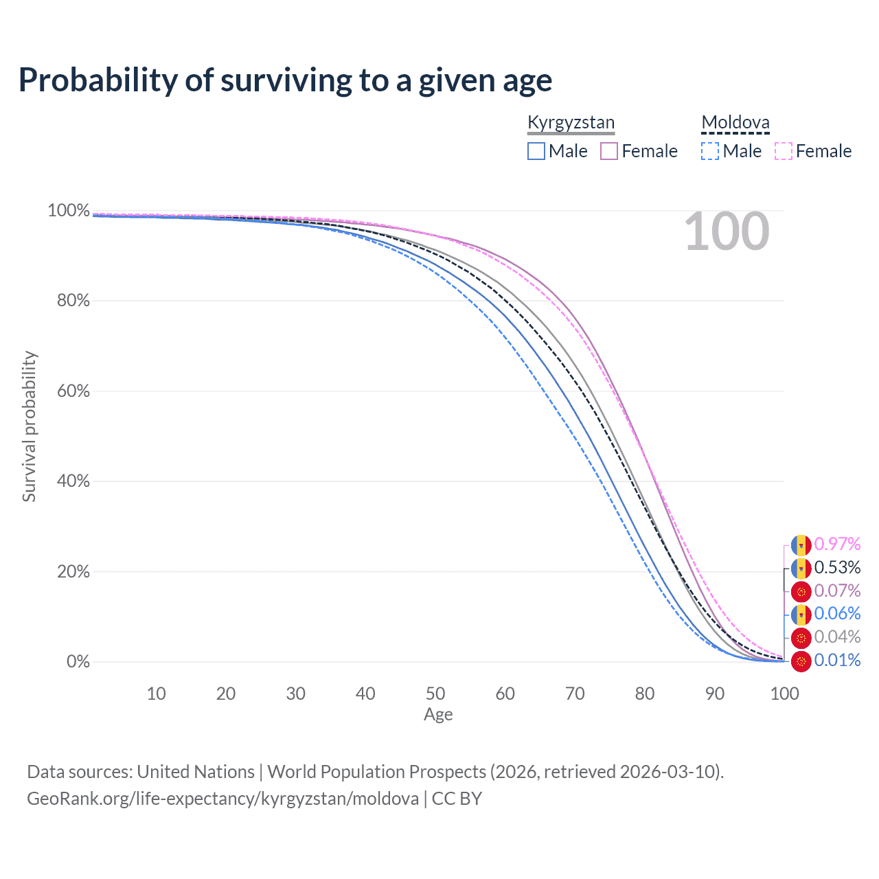 This life expectancy calculator shows the odds of living to 100, 95, 90, and below based on current age for both males and females in Kyrgyzstan and Moldova, along with mean and median age of death. The calculations are based on the 2026 life tables (actuarial tables) from the UN World Population Prospects.