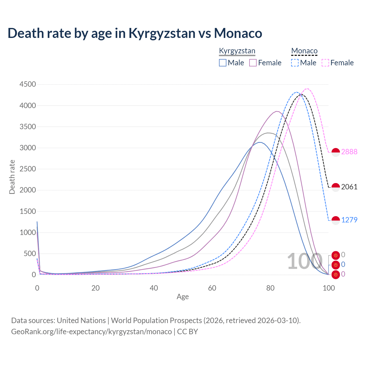 In Kyrgyzstan, the most common age of death is 79, compared to 91 in Monaco. The median age of death is 75.6 in Kyrgyzstan and 88.7 in Monaco, meaning only half of each cohort is expected to live past that age.