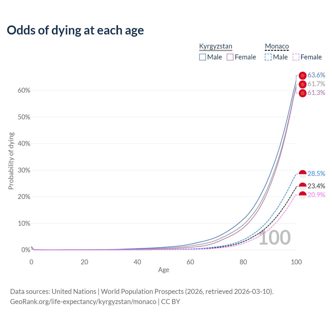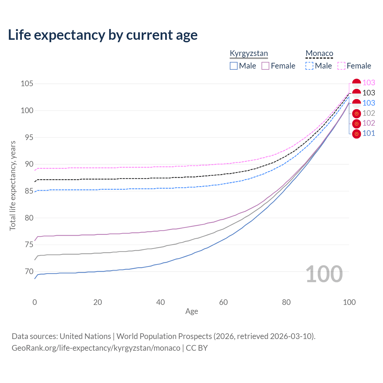 This life expectancy calculator shows the odds of living to 100, 95, 90, and below based on current age for both males and females in Kyrgyzstan and Monaco, along with mean and median age of death. The calculations are based on the 2026 life tables (actuarial tables) from the UN World Population Prospects.