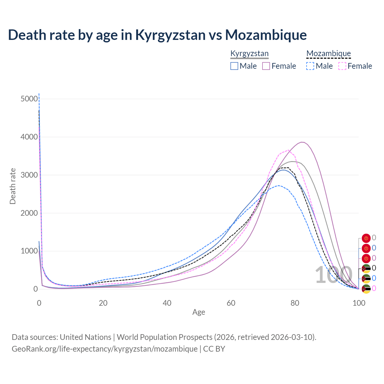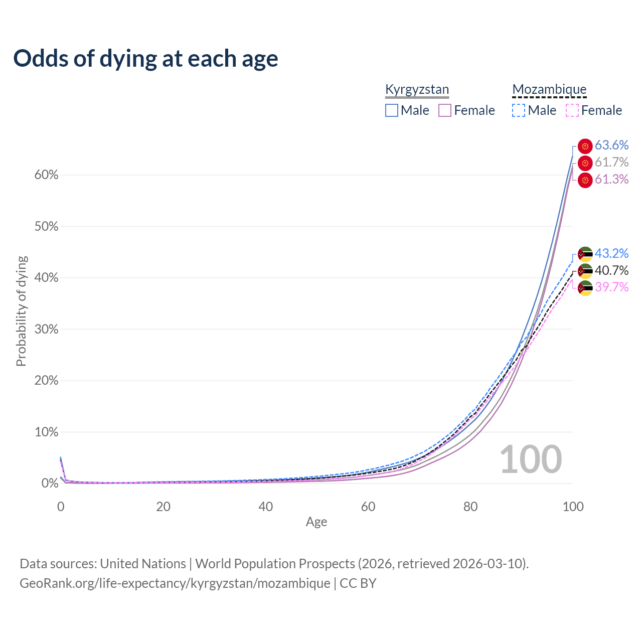 This life expectancy calculator shows the odds of living to 100, 95, 90, and below based on current age for both males and females in Kyrgyzstan and Mozambique, along with mean and median age of death. The calculations are based on the 2026 life tables (actuarial tables) from the UN World Population Prospects.
