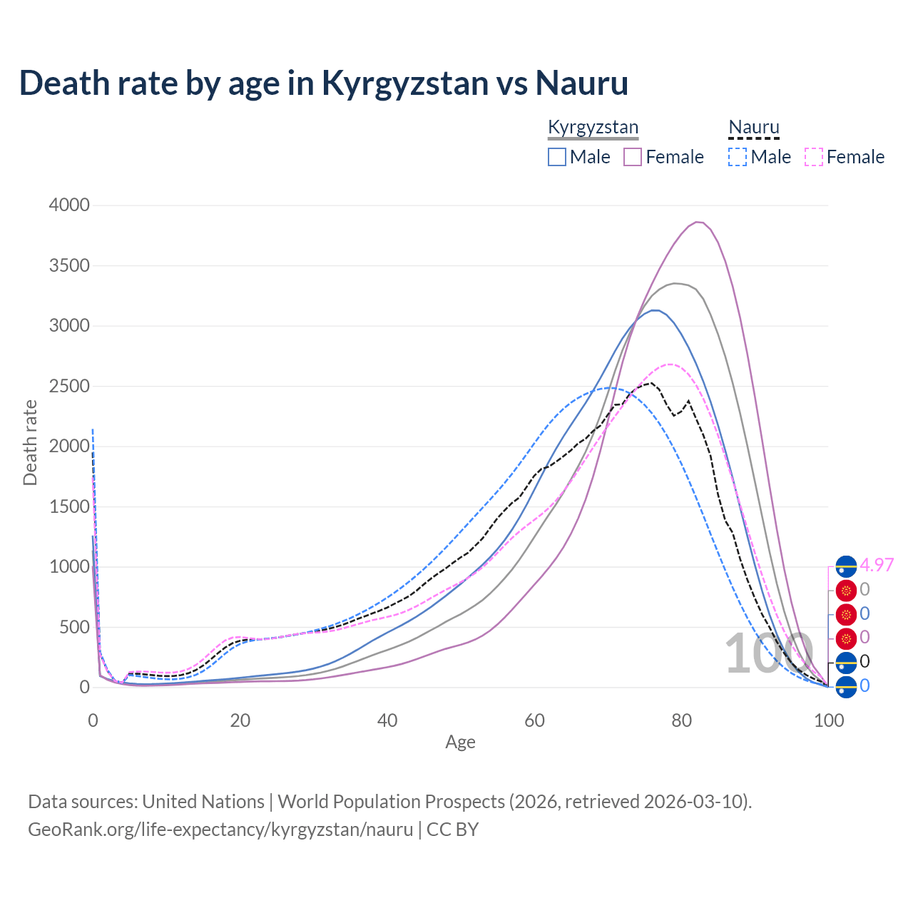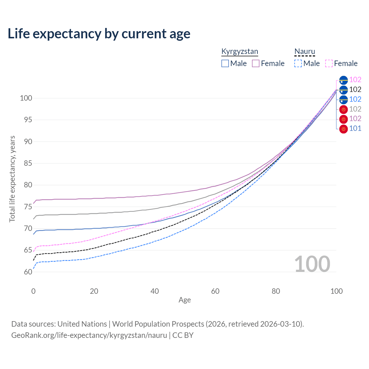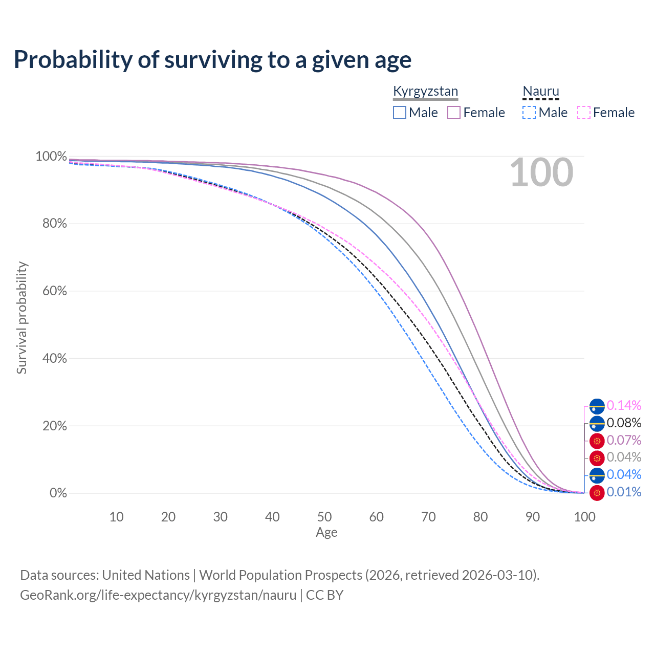 This life expectancy calculator shows the odds of living to 100, 95, 90, and below based on current age for both males and females in Kyrgyzstan and Nauru, along with mean and median age of death. The calculations are based on the 2026 life tables (actuarial tables) from the UN World Population Prospects.