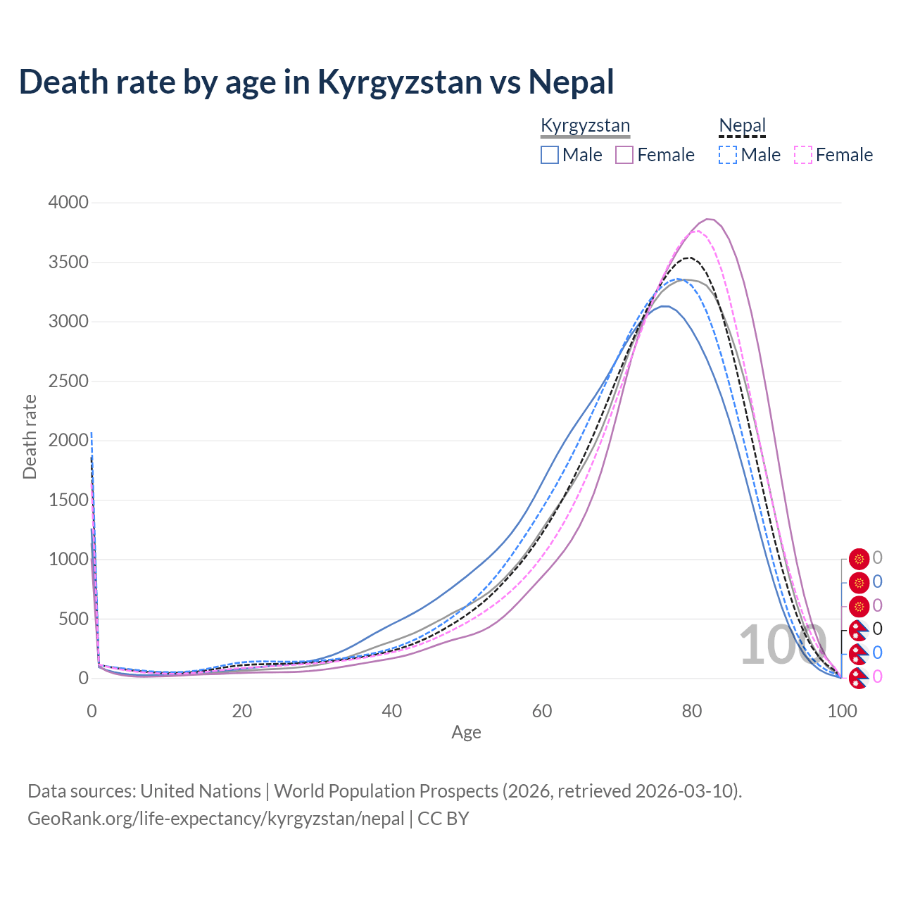 In Kyrgyzstan, the most common age of death is 79, compared to 80 in Nepal. The median age of death is 75.6 in Kyrgyzstan and 75.4 in Nepal, meaning only half of each cohort is expected to live past that age.