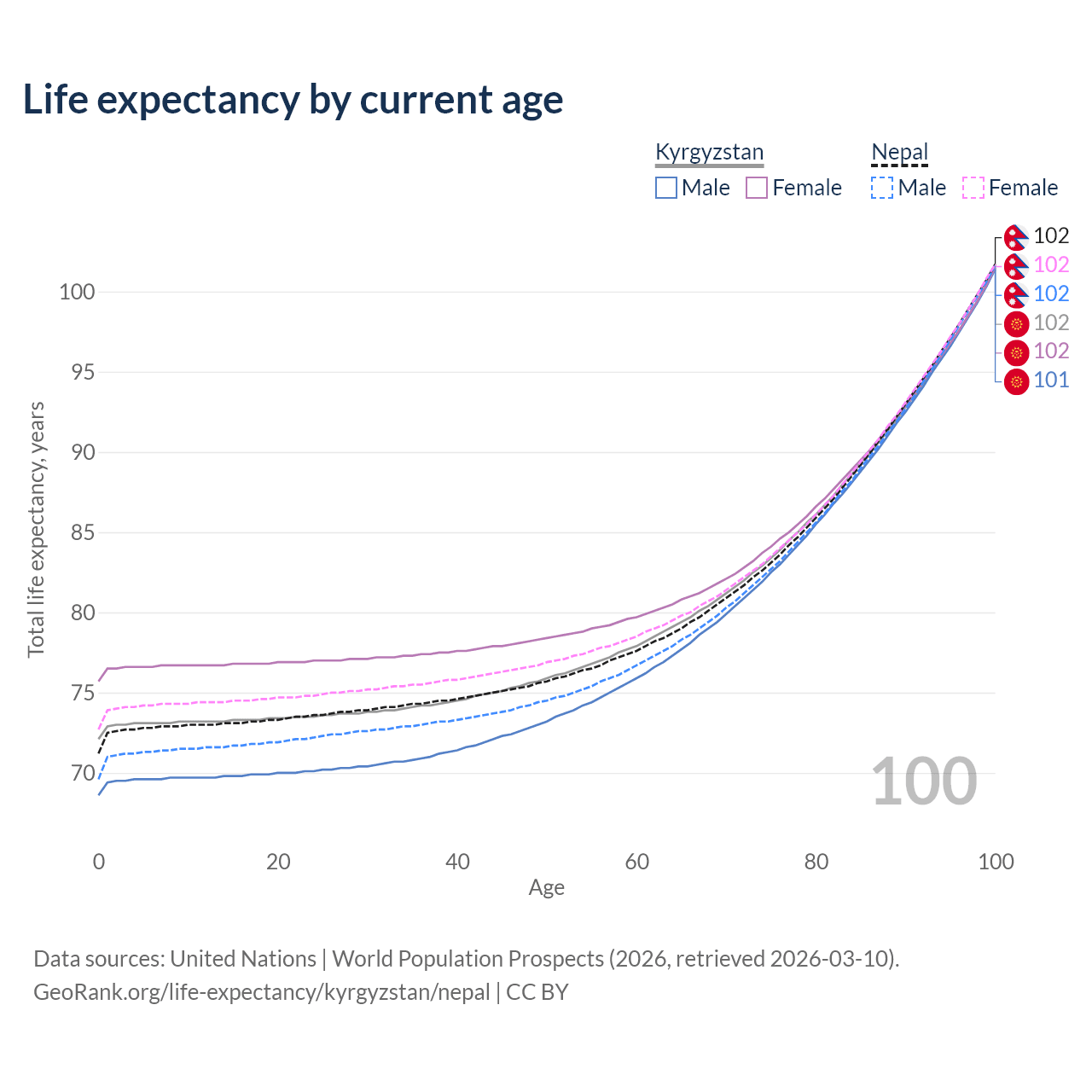 This life expectancy calculator shows the odds of living to 100, 95, 90, and below based on current age for both males and females in Kyrgyzstan and Nepal, along with mean and median age of death. The calculations are based on the 2026 life tables (actuarial tables) from the UN World Population Prospects.