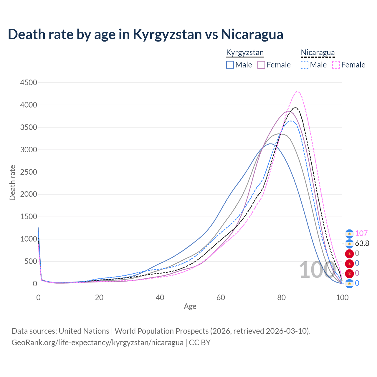 In Kyrgyzstan, the most common age of death is 79, compared to 85 in Nicaragua. The median age of death is 75.6 in Kyrgyzstan and 79.9 in Nicaragua, meaning only half of each cohort is expected to live past that age.