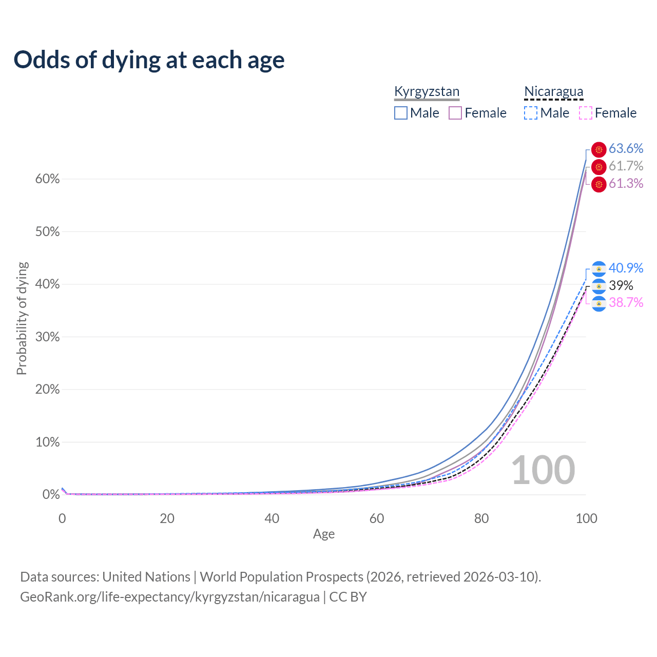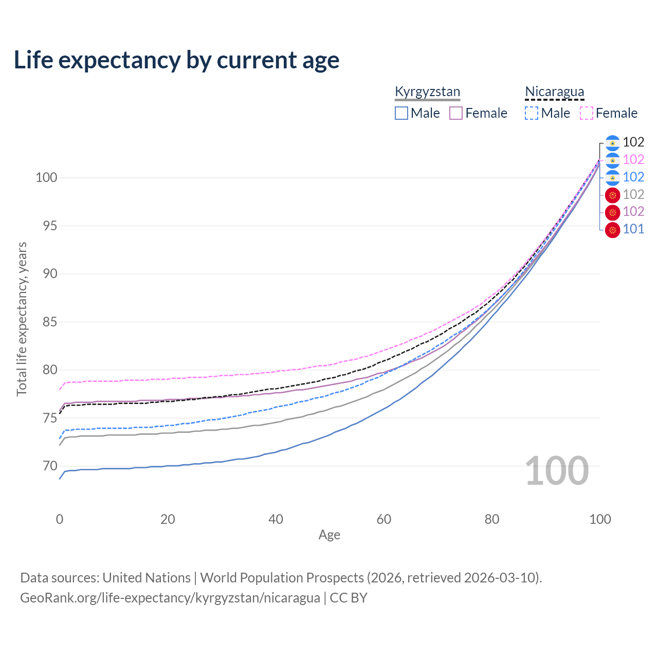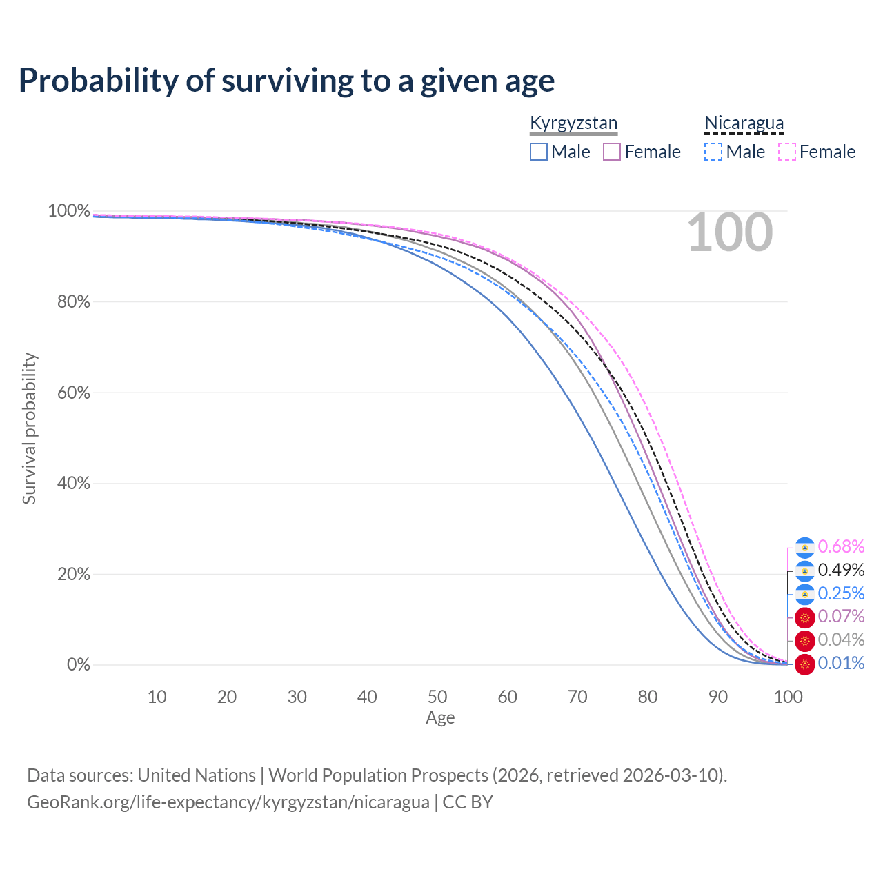 This life expectancy calculator shows the odds of living to 100, 95, 90, and below based on current age for both males and females in Kyrgyzstan and Nicaragua, along with mean and median age of death. The calculations are based on the 2026 life tables (actuarial tables) from the UN World Population Prospects.