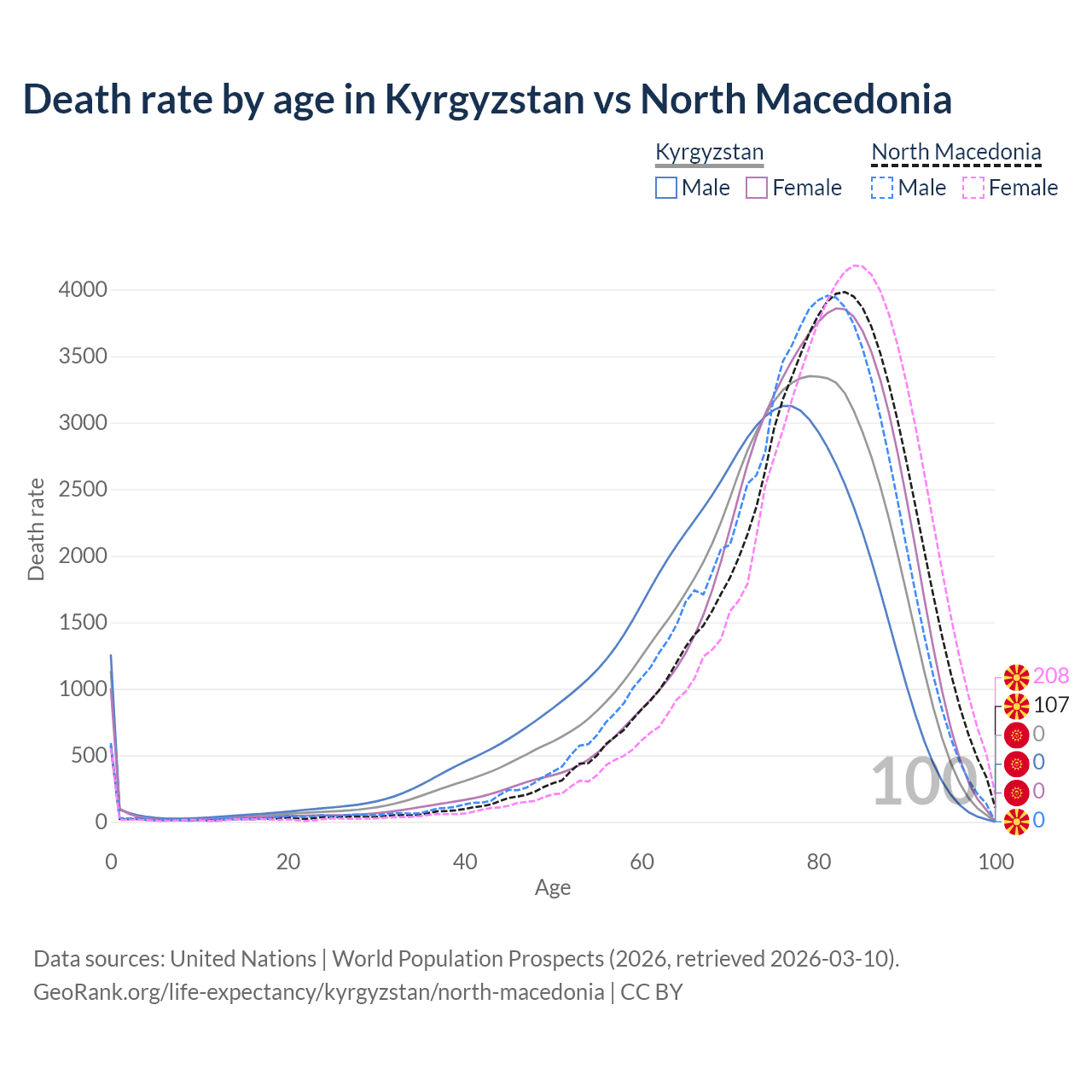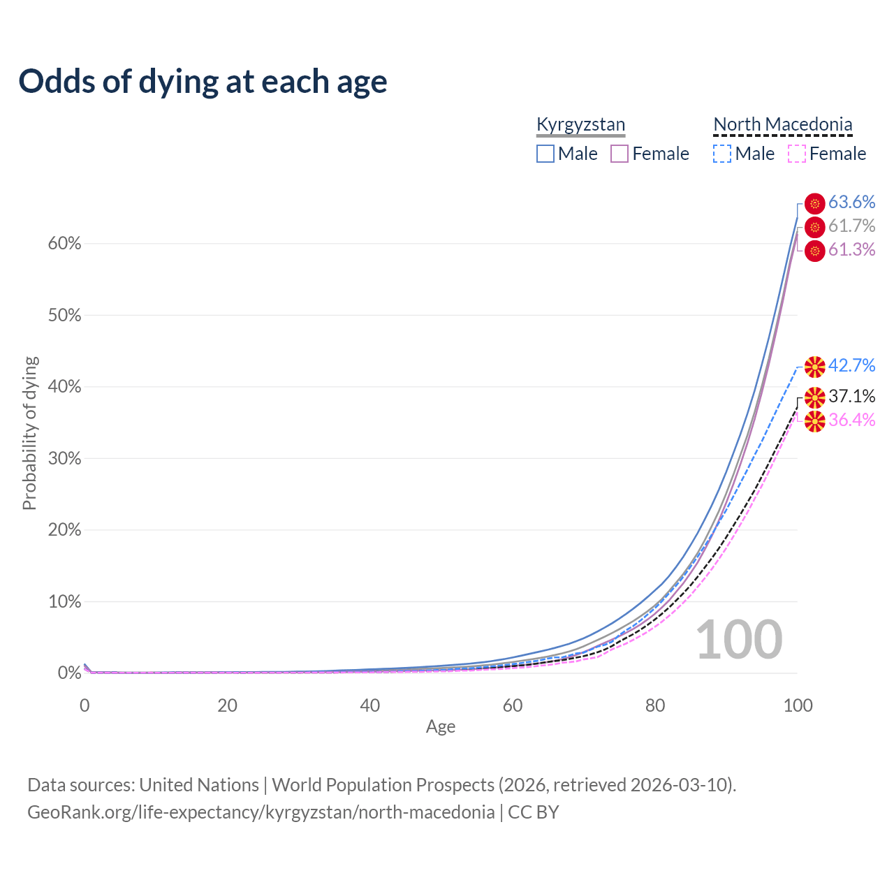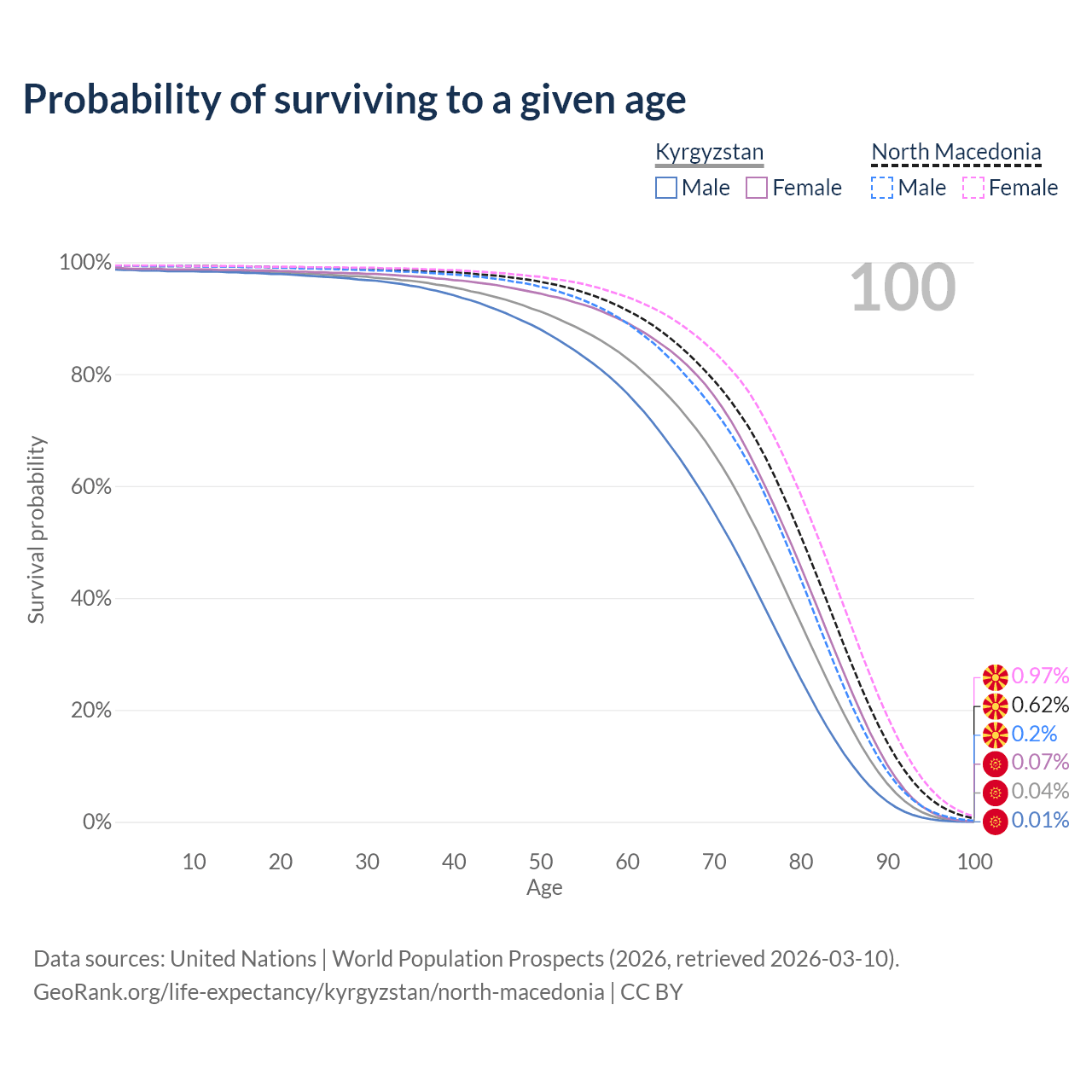 This life expectancy calculator shows the odds of living to 100, 95, 90, and below based on current age for both males and females in Kyrgyzstan and North Macedonia, along with mean and median age of death. The calculations are based on the 2026 life tables (actuarial tables) from the UN World Population Prospects.