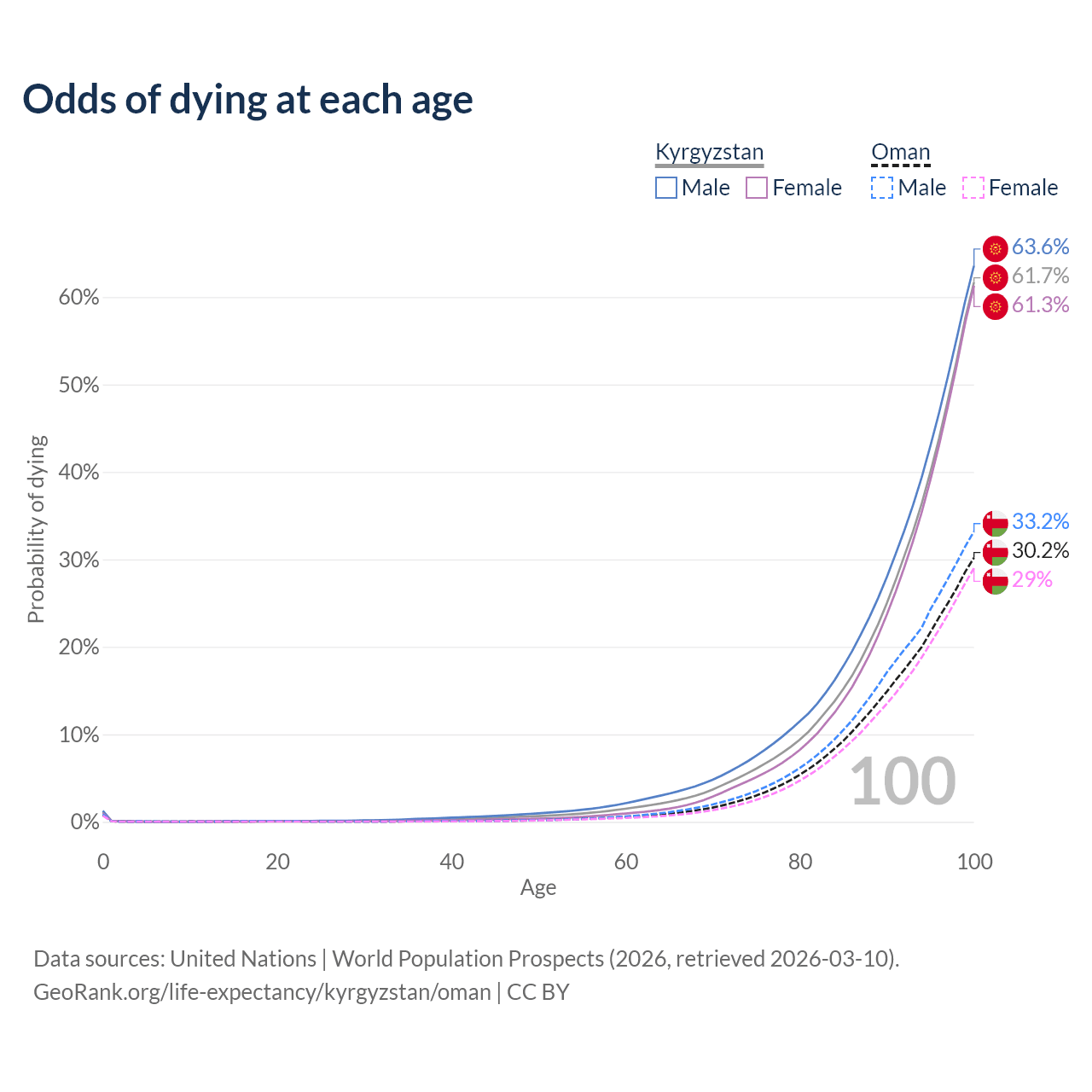 This life expectancy calculator shows the odds of living to 100, 95, 90, and below based on current age for both males and females in Kyrgyzstan and Oman, along with mean and median age of death. The calculations are based on the 2026 life tables (actuarial tables) from the UN World Population Prospects.