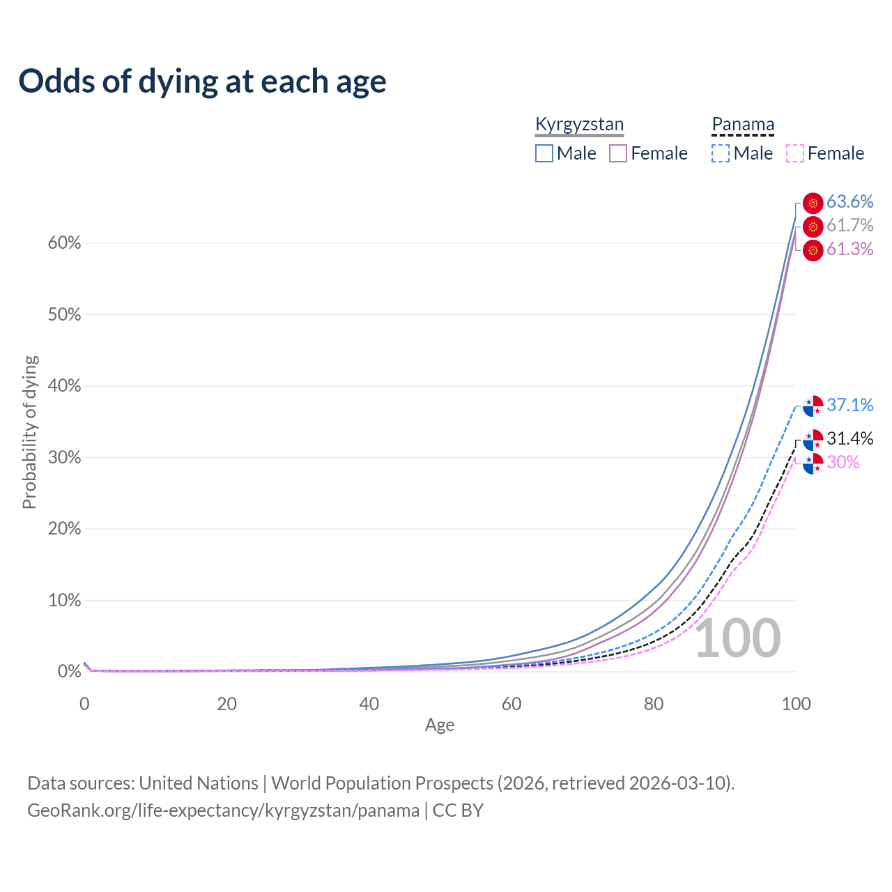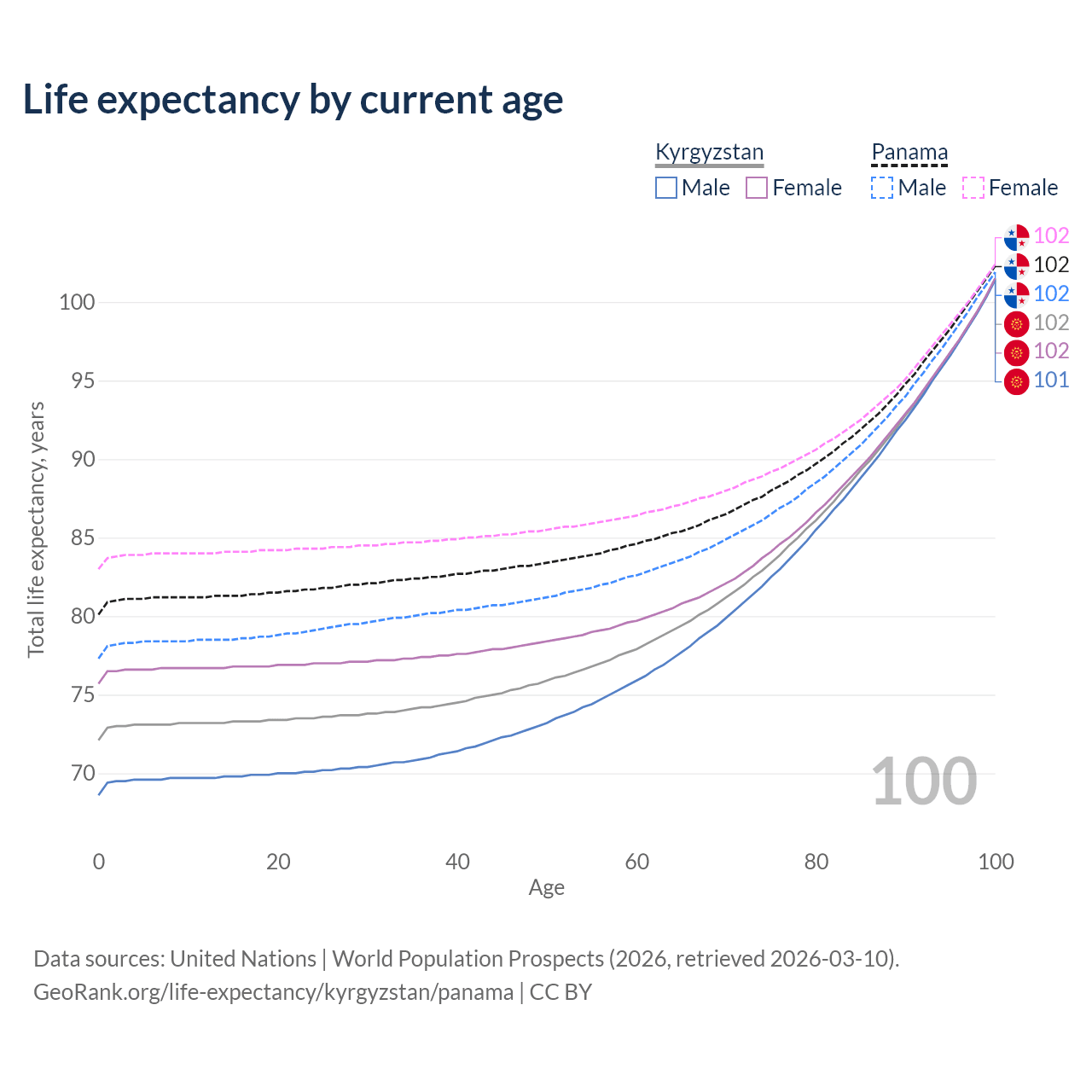 This life expectancy calculator shows the odds of living to 100, 95, 90, and below based on current age for both males and females in Kyrgyzstan and Panama, along with mean and median age of death. The calculations are based on the 2026 life tables (actuarial tables) from the UN World Population Prospects.