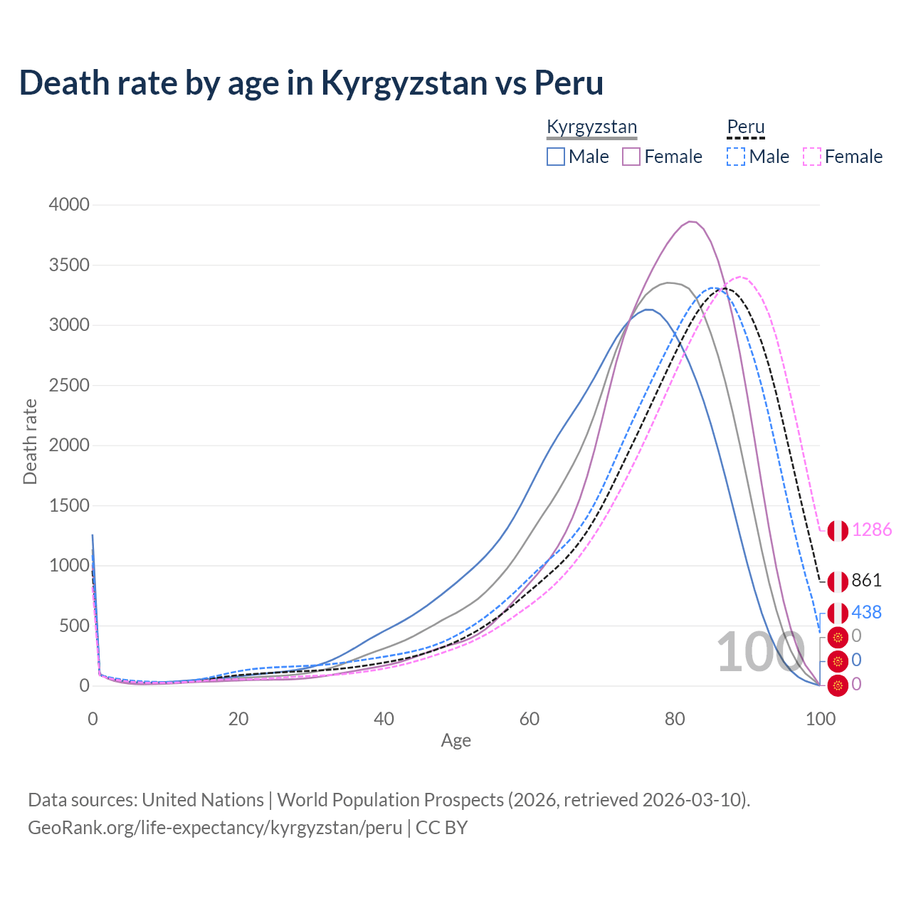 In Kyrgyzstan, the most common age of death is 79, compared to 87 in Peru. The median age of death is 75.6 in Kyrgyzstan and 82.4 in Peru, meaning only half of each cohort is expected to live past that age.