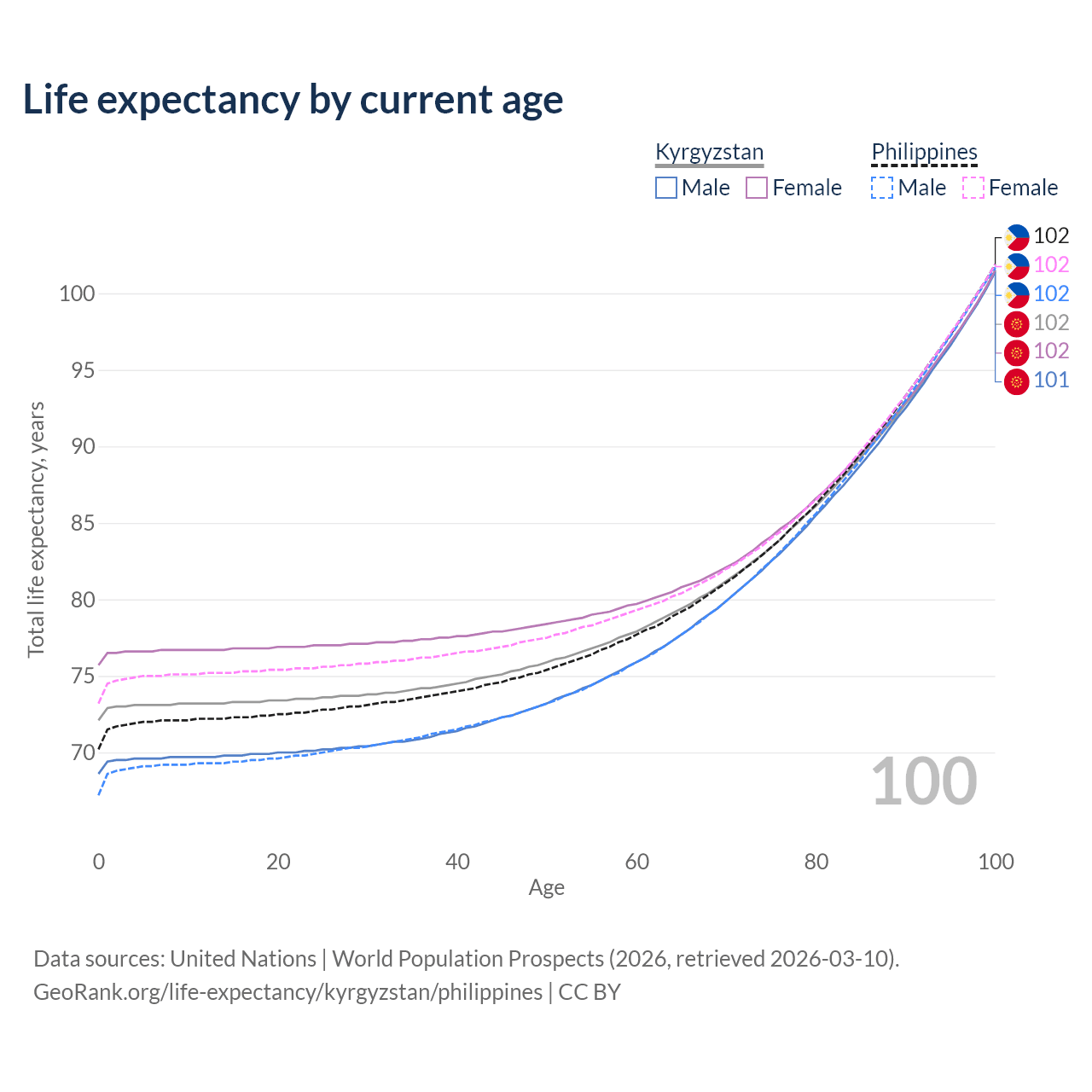 This life expectancy calculator shows the odds of living to 100, 95, 90, and below based on current age for both males and females in Kyrgyzstan and the Philippines, along with mean and median age of death. The calculations are based on the 2026 life tables (actuarial tables) from the UN World Population Prospects.