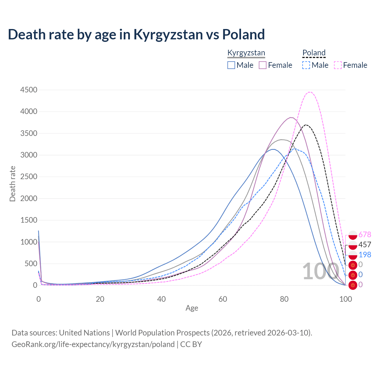In Kyrgyzstan, the most common age of death is 79, compared to 87 in Poland. The median age of death is 75.6 in Kyrgyzstan and 82.5 in Poland, meaning only half of each cohort is expected to live past that age.