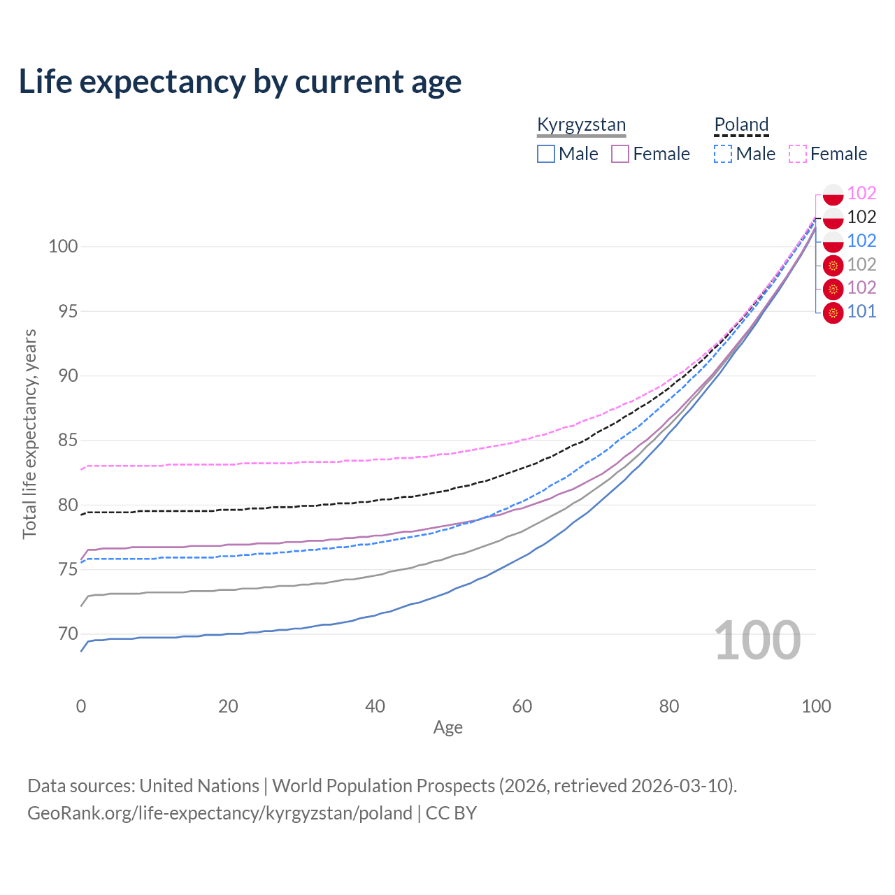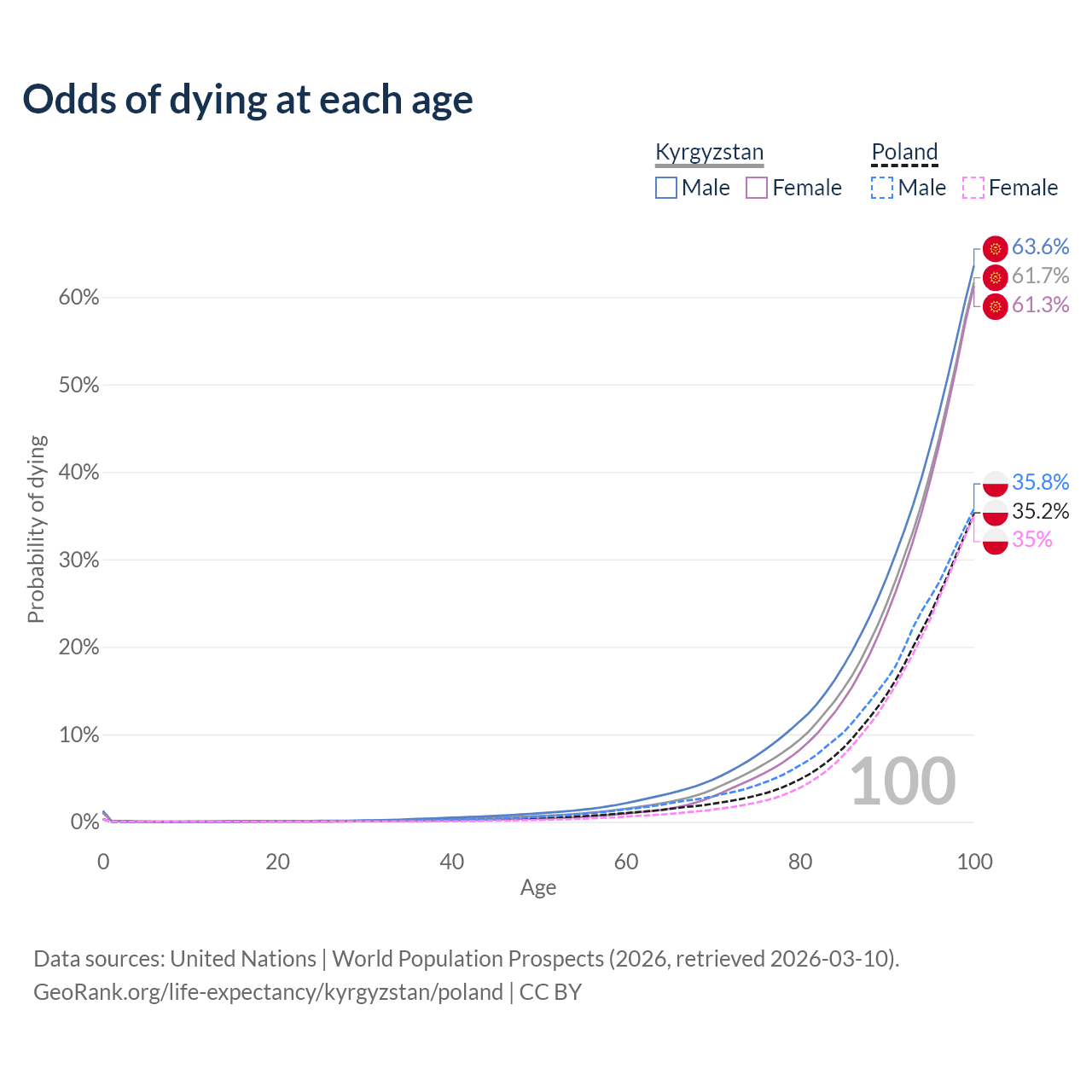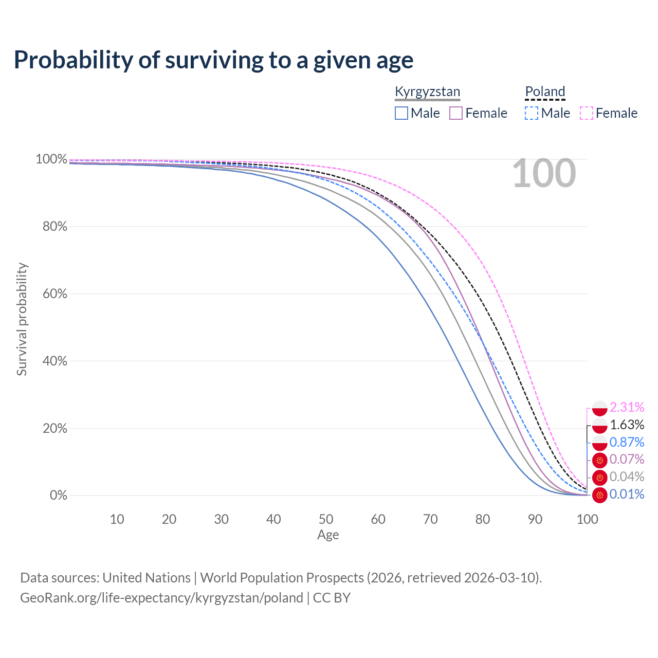 This life expectancy calculator shows the odds of living to 100, 95, 90, and below based on current age for both males and females in Kyrgyzstan and Poland, along with mean and median age of death. The calculations are based on the 2026 life tables (actuarial tables) from the UN World Population Prospects.