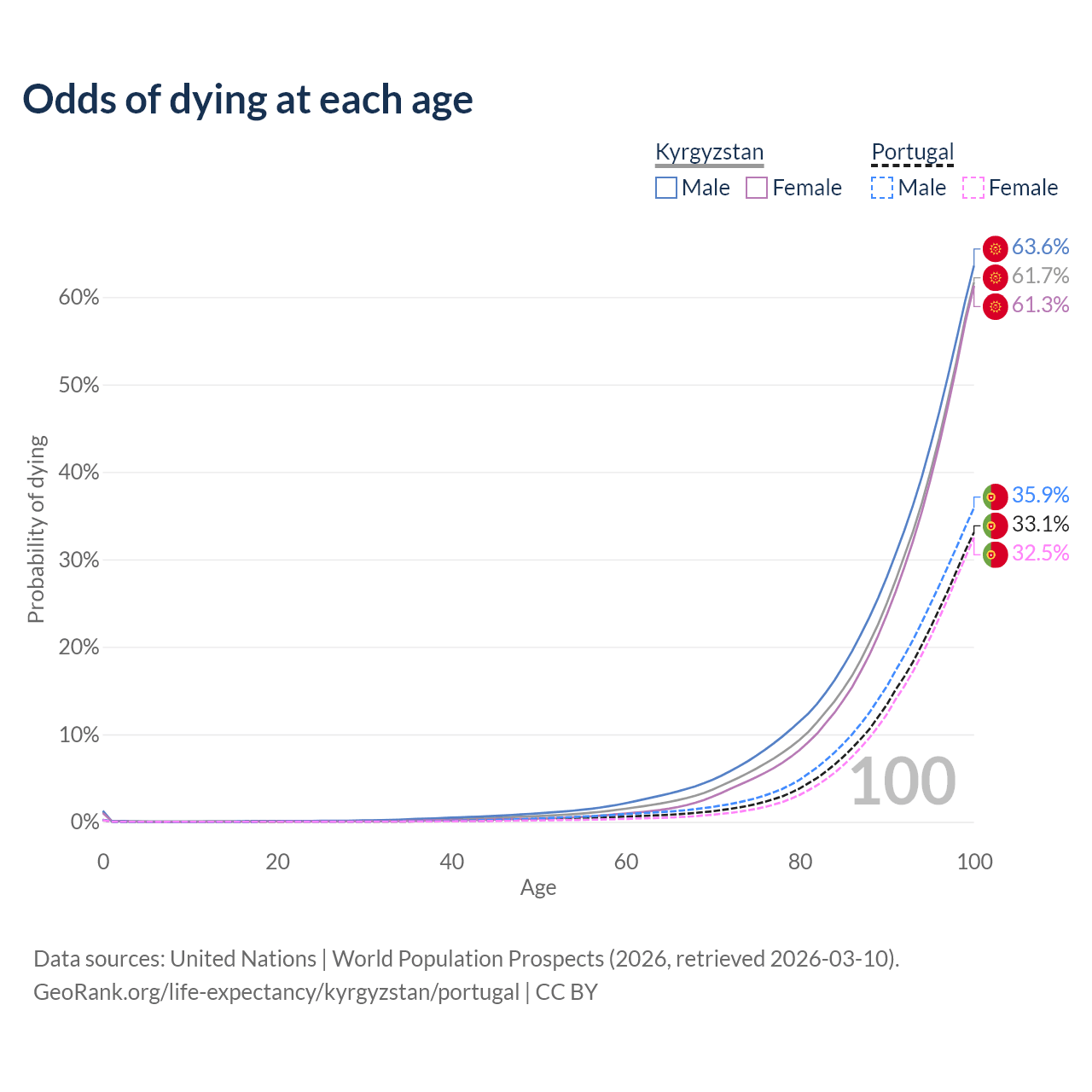 This life expectancy calculator shows the odds of living to 100, 95, 90, and below based on current age for both males and females in Kyrgyzstan and Portugal, along with mean and median age of death. The calculations are based on the 2026 life tables (actuarial tables) from the UN World Population Prospects.
