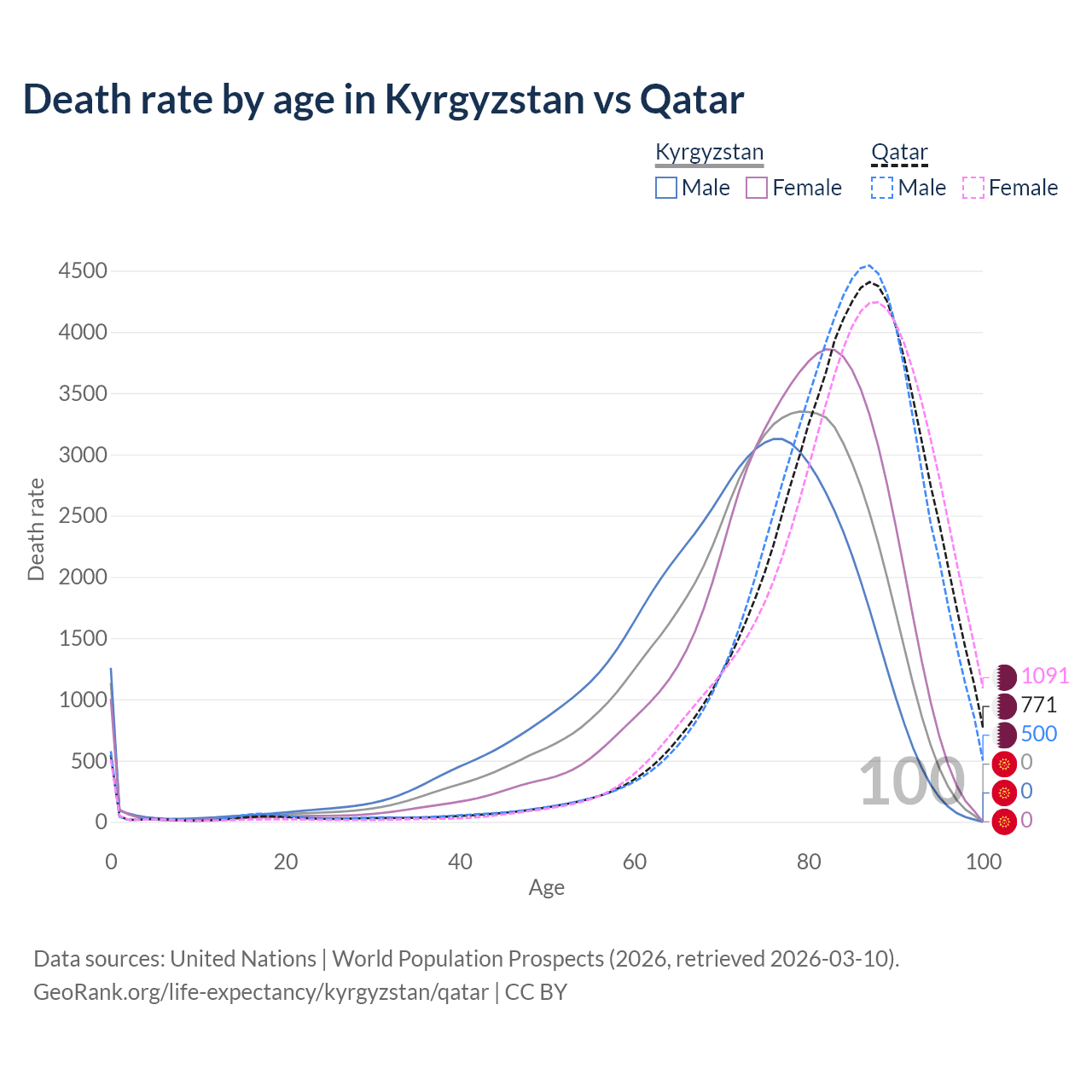 This life expectancy calculator shows the odds of living to 100, 95, 90, and below based on current age for both males and females in Kyrgyzstan and Qatar, along with mean and median age of death. The calculations are based on the 2026 life tables (actuarial tables) from the UN World Population Prospects.