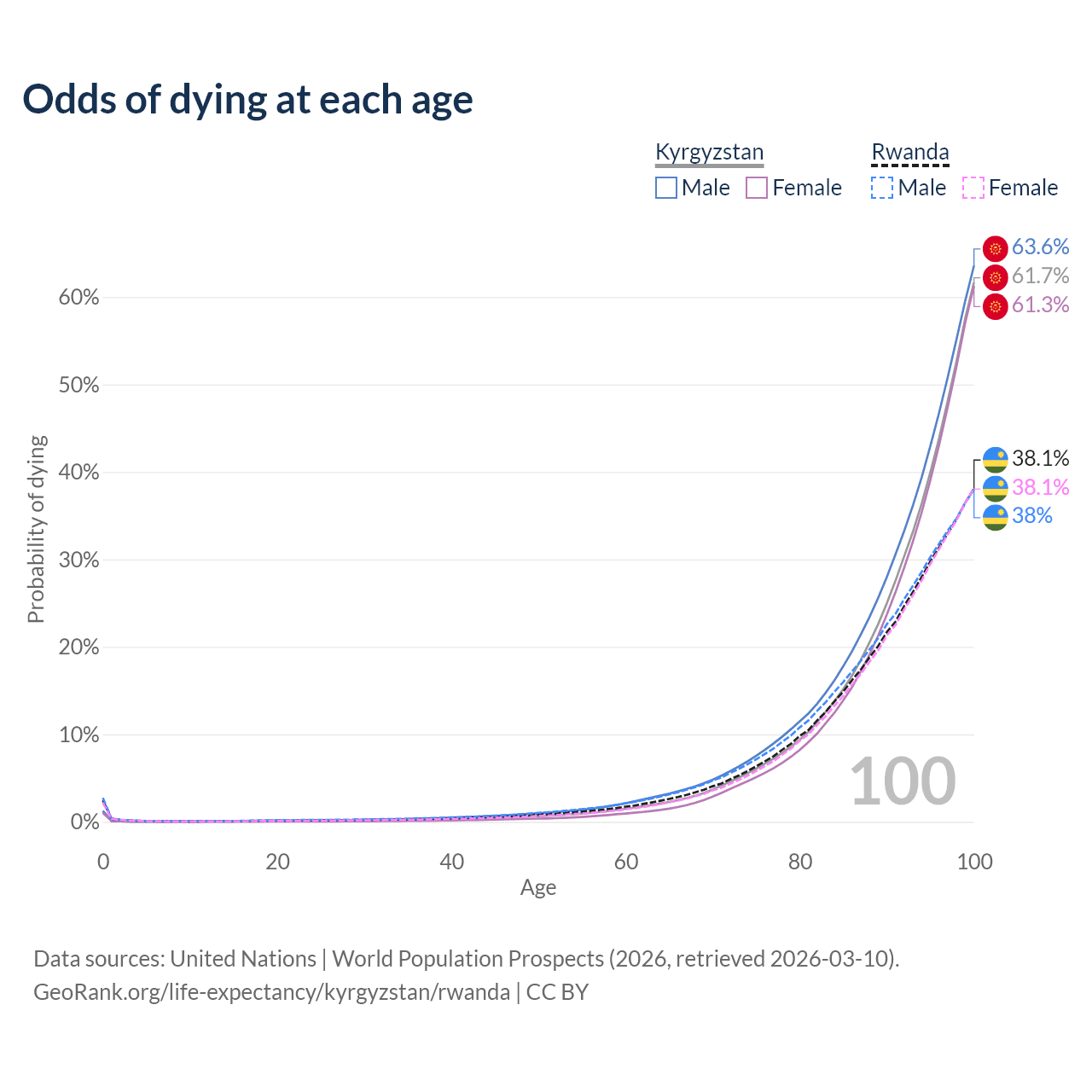 This life expectancy calculator shows the odds of living to 100, 95, 90, and below based on current age for both males and females in Kyrgyzstan and Rwanda, along with mean and median age of death. The calculations are based on the 2026 life tables (actuarial tables) from the UN World Population Prospects.
