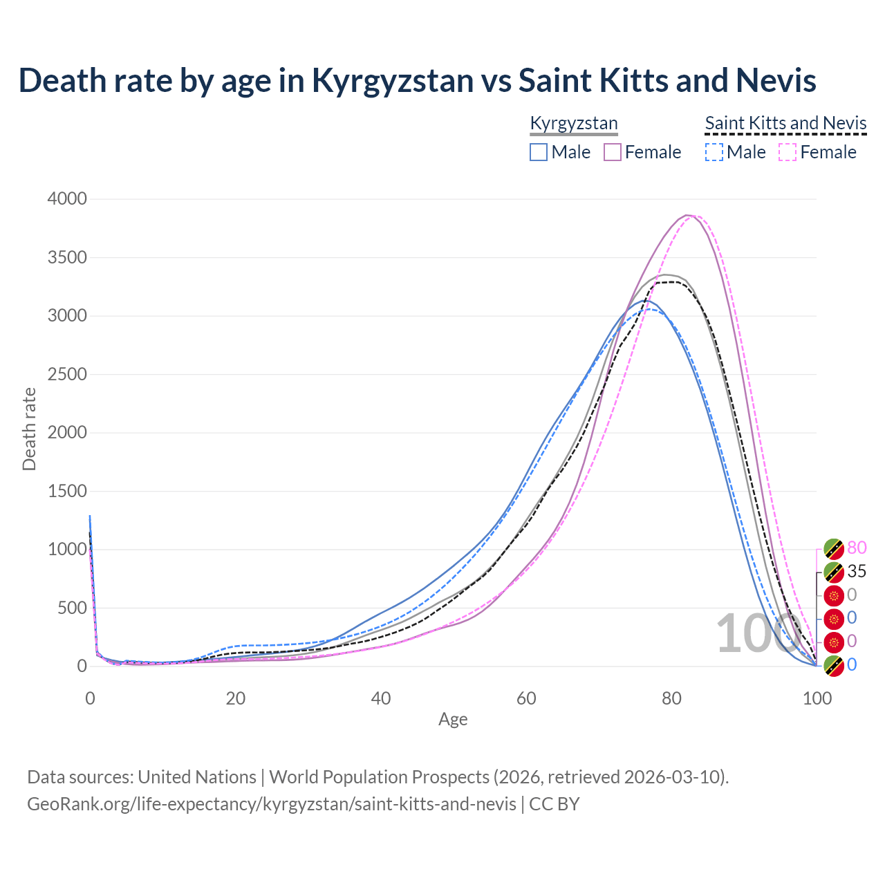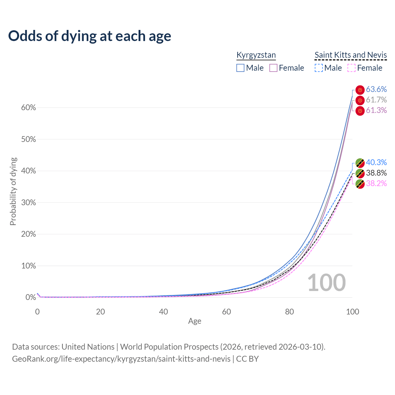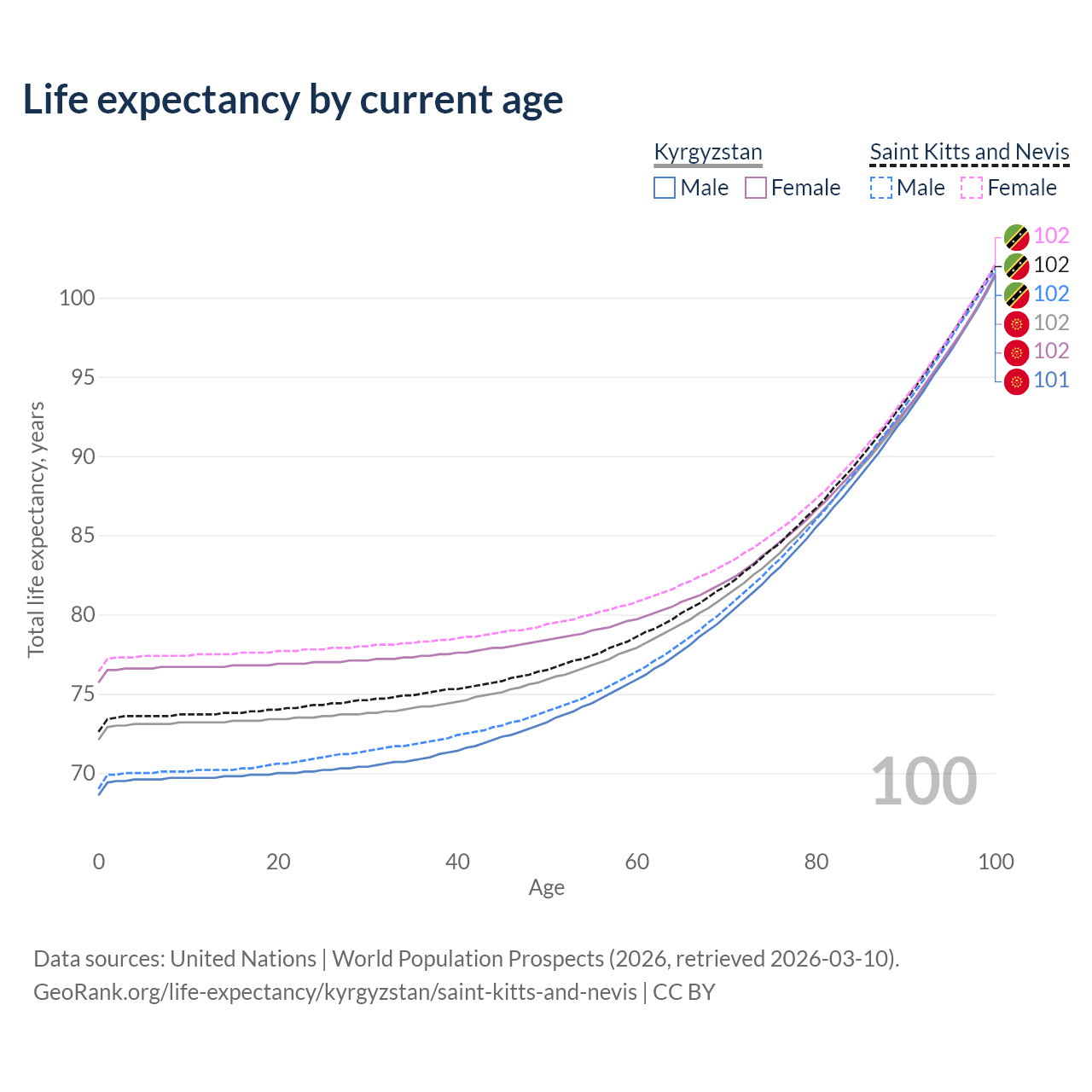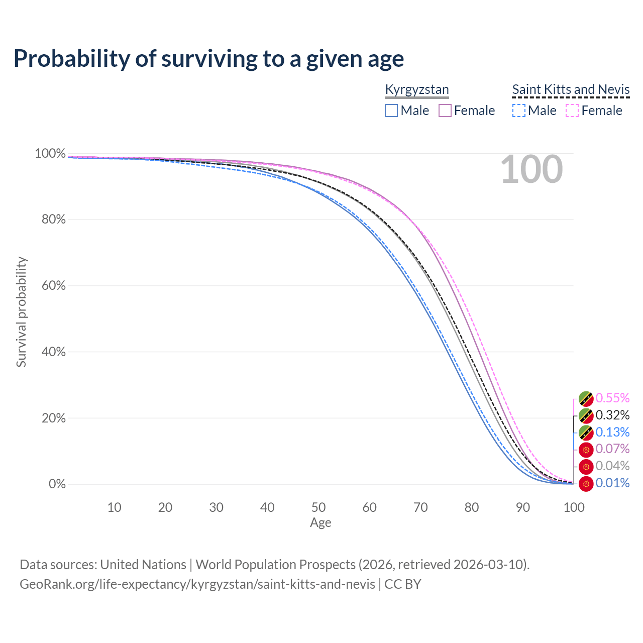 This life expectancy calculator shows the odds of living to 100, 95, 90, and below based on current age for both males and females in Kyrgyzstan and Saint Kitts and Nevis, along with mean and median age of death. The calculations are based on the 2026 life tables (actuarial tables) from the UN World Population Prospects.