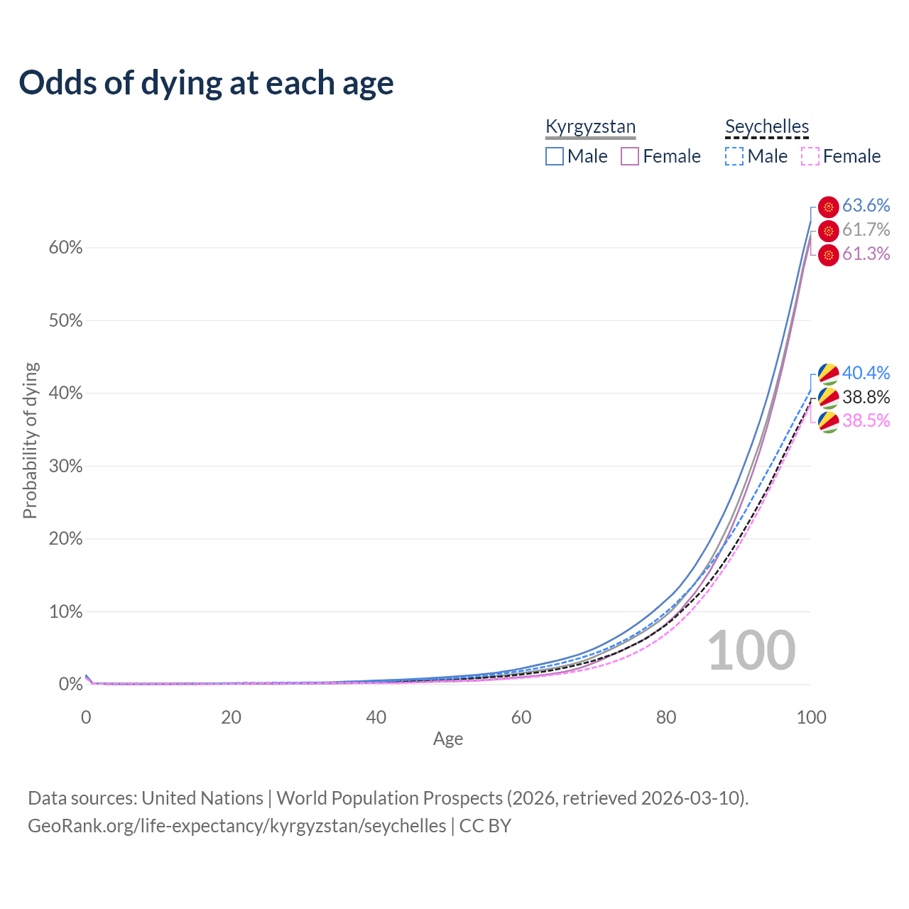 This life expectancy calculator shows the odds of living to 100, 95, 90, and below based on current age for both males and females in Kyrgyzstan and the Seychelles, along with mean and median age of death. The calculations are based on the 2026 life tables (actuarial tables) from the UN World Population Prospects.