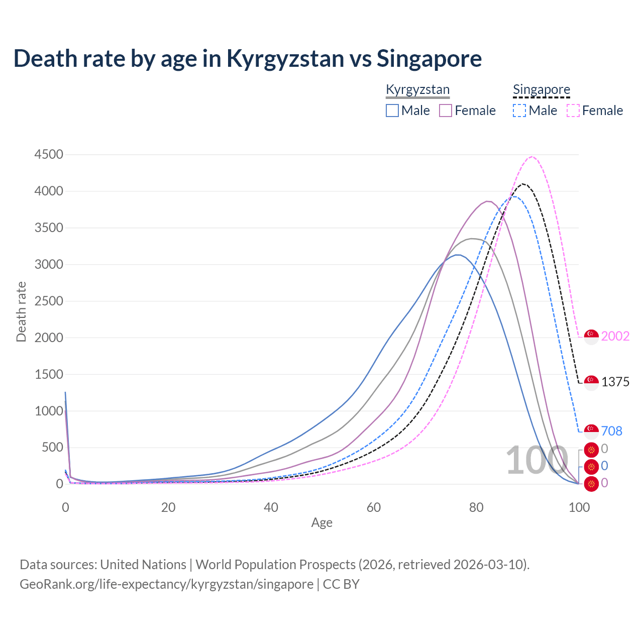 In Kyrgyzstan, the most common age of death is 79, compared to 89 in Singapore. The median age of death is 75.6 in Kyrgyzstan and 86.5 in Singapore, meaning only half of each cohort is expected to live past that age.