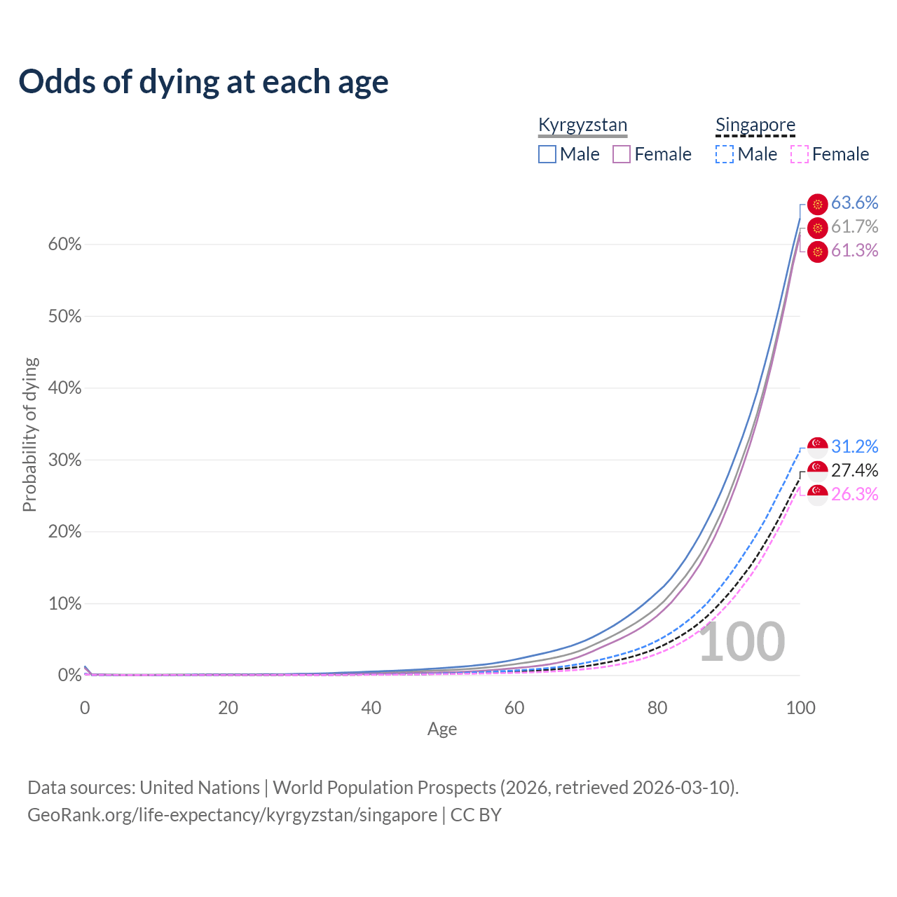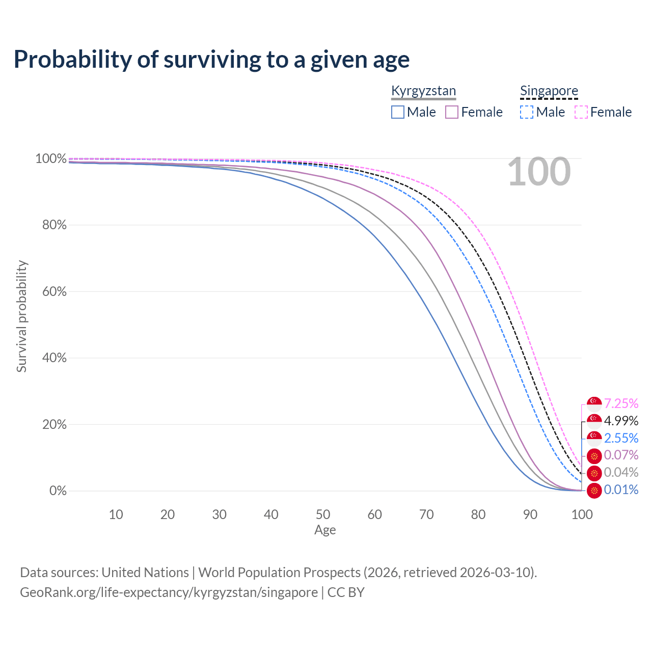 This life expectancy calculator shows the odds of living to 100, 95, 90, and below based on current age for both males and females in Kyrgyzstan and Singapore, along with mean and median age of death. The calculations are based on the 2026 life tables (actuarial tables) from the UN World Population Prospects.