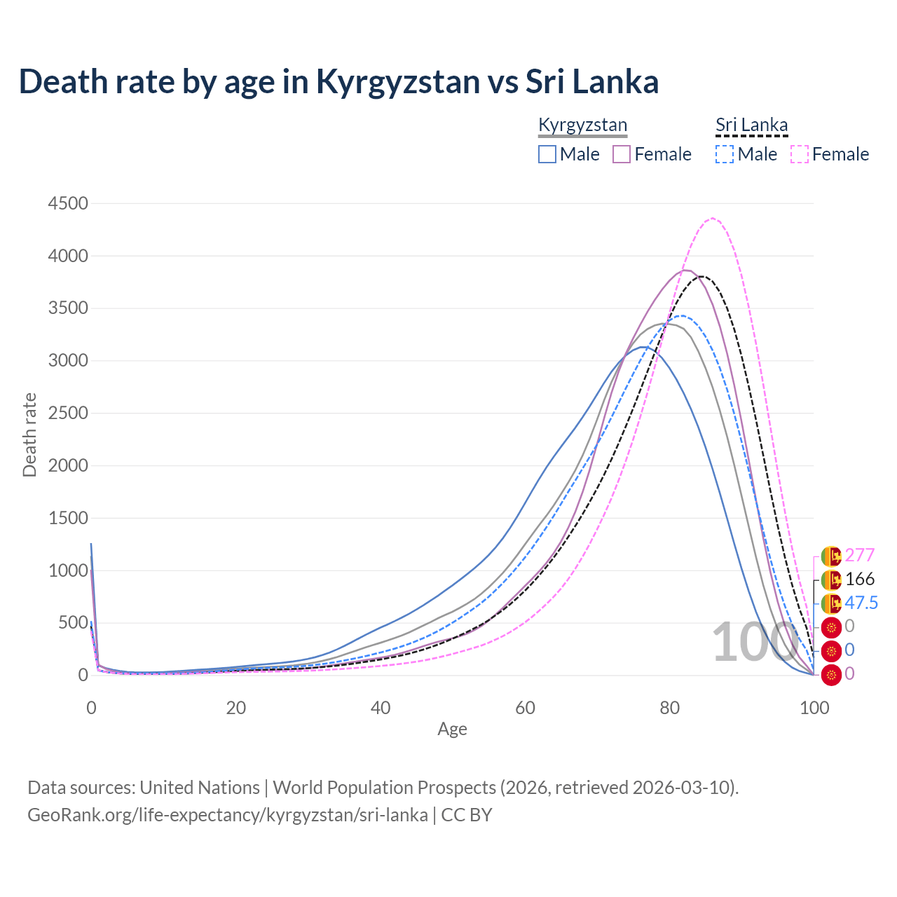 In Kyrgyzstan, the most common age of death is 79, compared to 85 in Sri Lanka. The median age of death is 75.6 in Kyrgyzstan and 81 in Sri Lanka, meaning only half of each cohort is expected to live past that age.