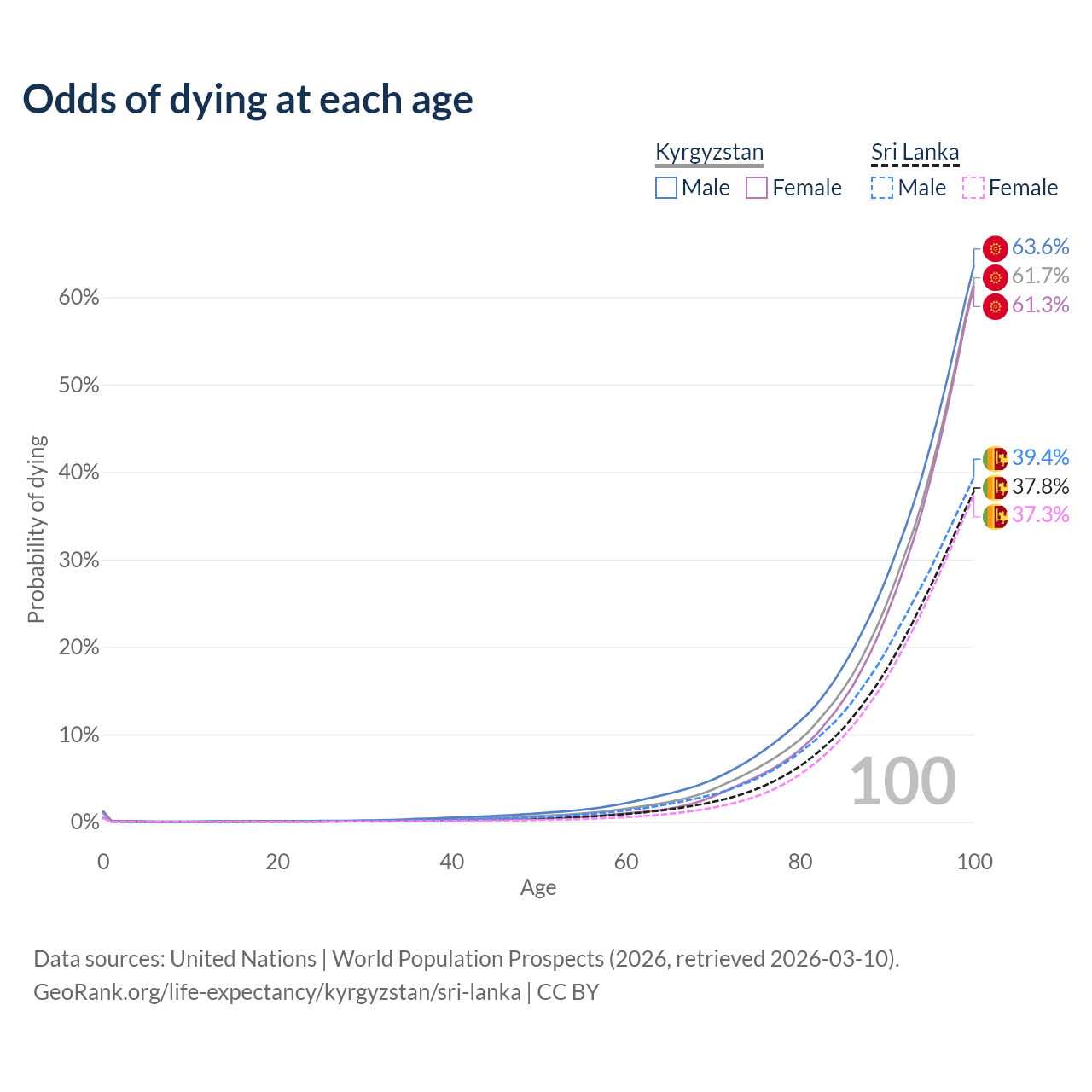 This life expectancy calculator shows the odds of living to 100, 95, 90, and below based on current age for both males and females in Kyrgyzstan and Sri Lanka, along with mean and median age of death. The calculations are based on the 2026 life tables (actuarial tables) from the UN World Population Prospects.