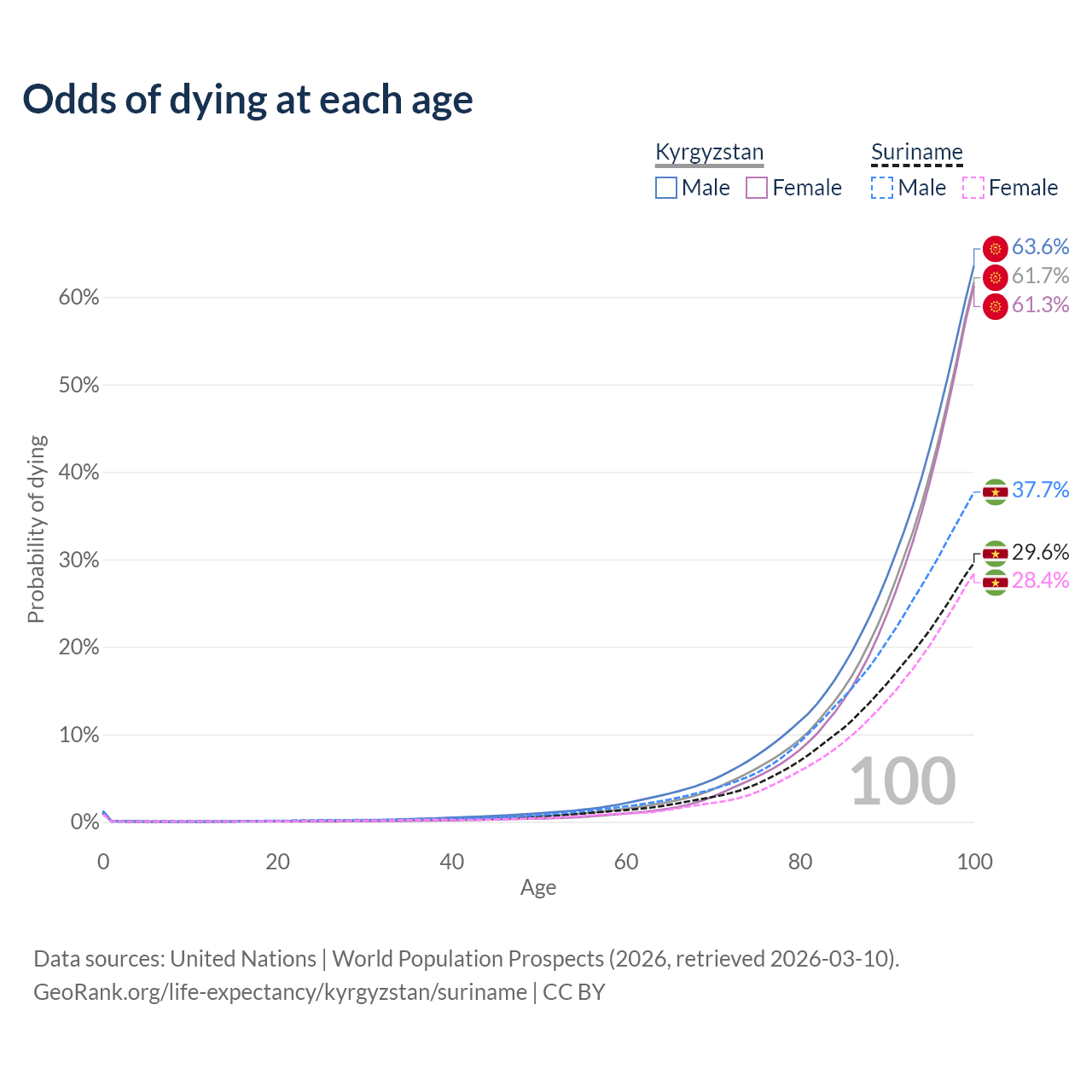 This life expectancy calculator shows the odds of living to 100, 95, 90, and below based on current age for both males and females in Kyrgyzstan and Suriname, along with mean and median age of death. The calculations are based on the 2026 life tables (actuarial tables) from the UN World Population Prospects.