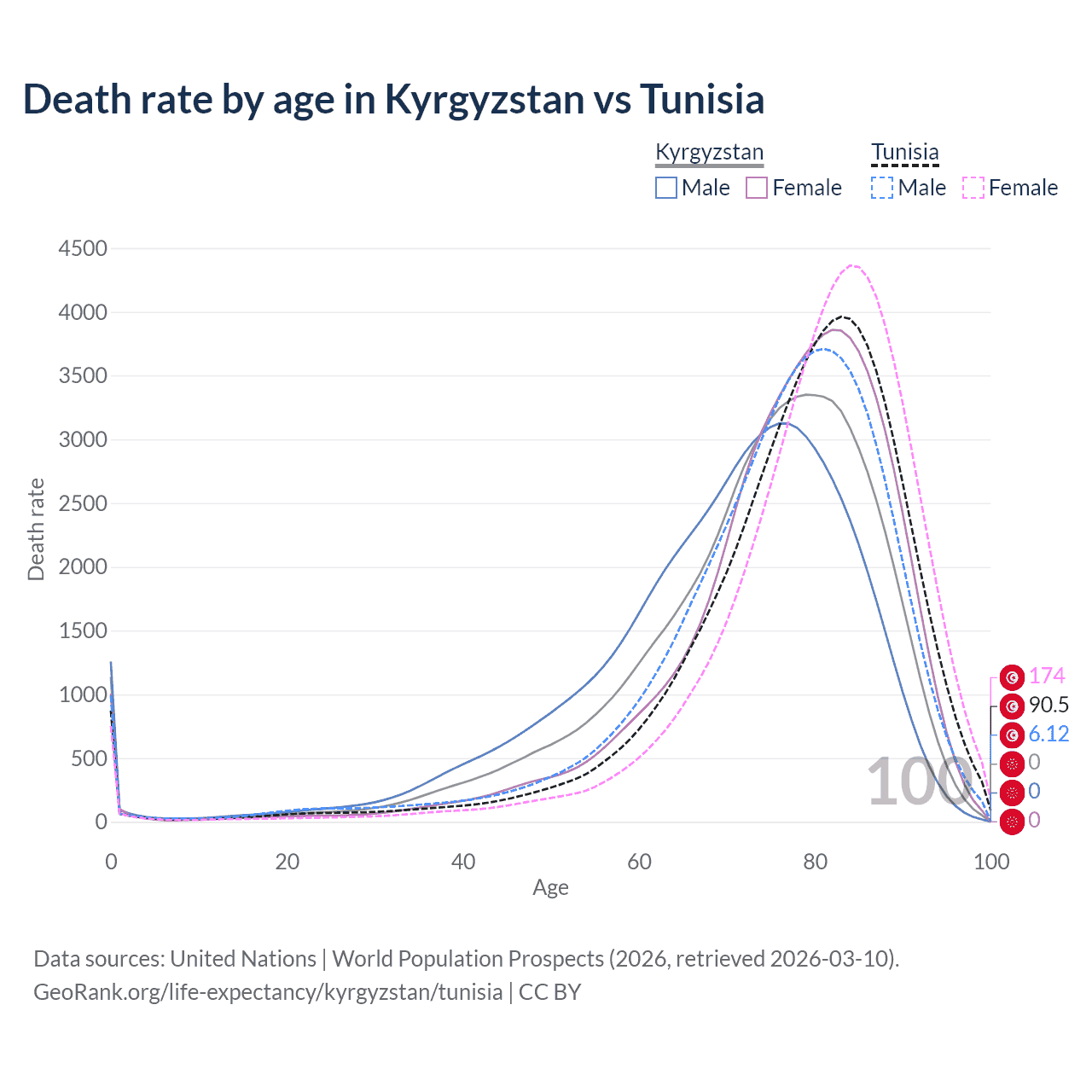 In Kyrgyzstan, the most common age of death is 79, compared to 83 in Tunisia. The median age of death is 75.6 in Kyrgyzstan and 80.2 in Tunisia, meaning only half of each cohort is expected to live past that age.