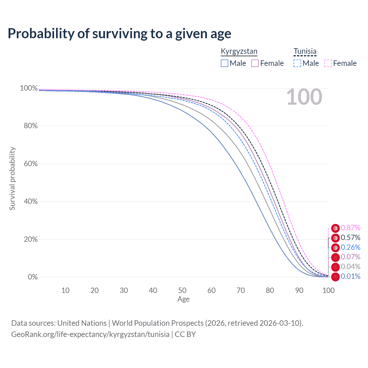 This life expectancy calculator shows the odds of living to 100, 95, 90, and below based on current age for both males and females in Kyrgyzstan and Tunisia, along with mean and median age of death. The calculations are based on the 2026 life tables (actuarial tables) from the UN World Population Prospects.