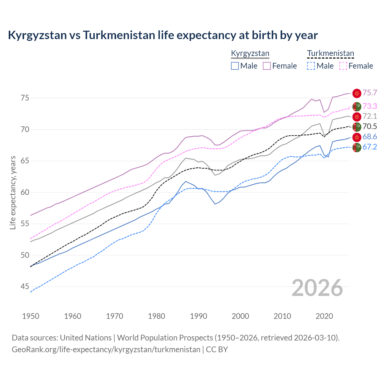 Kyrgyzstan vs Turkmenistan life expectancy at birth by year
