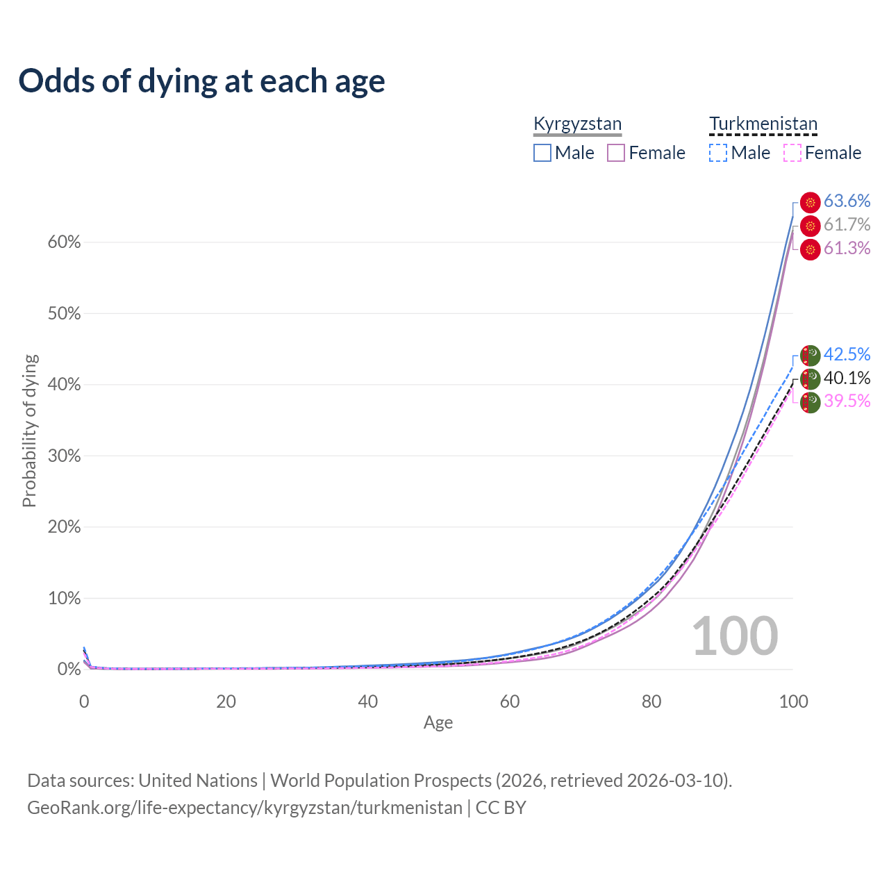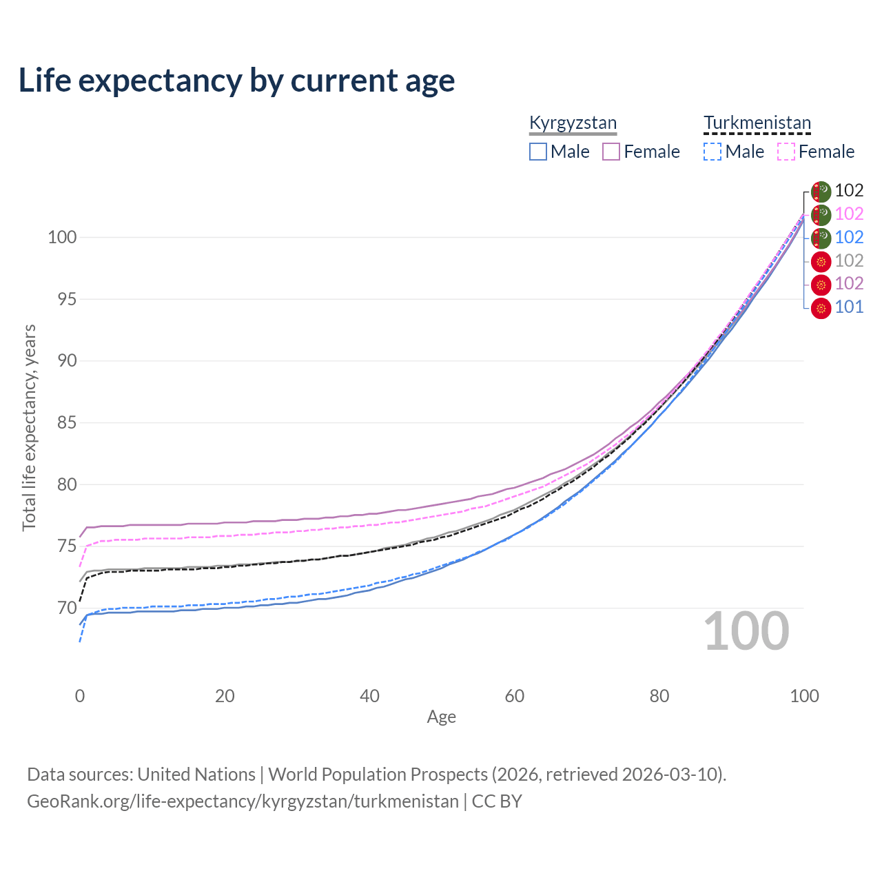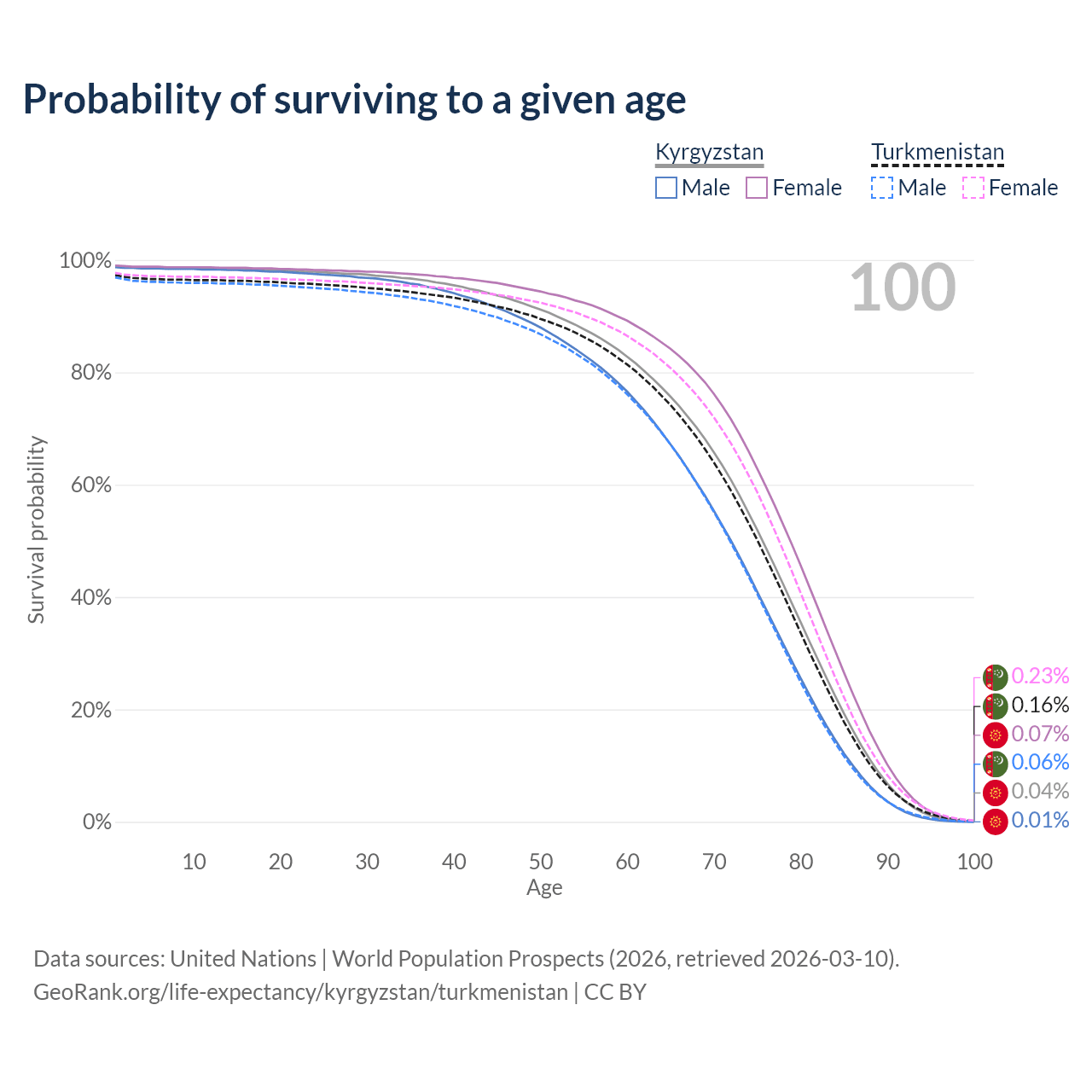 This life expectancy calculator shows the odds of living to 100, 95, 90, and below based on current age for both males and females in Kyrgyzstan and Turkmenistan, along with mean and median age of death. The calculations are based on the 2026 life tables (actuarial tables) from the UN World Population Prospects.