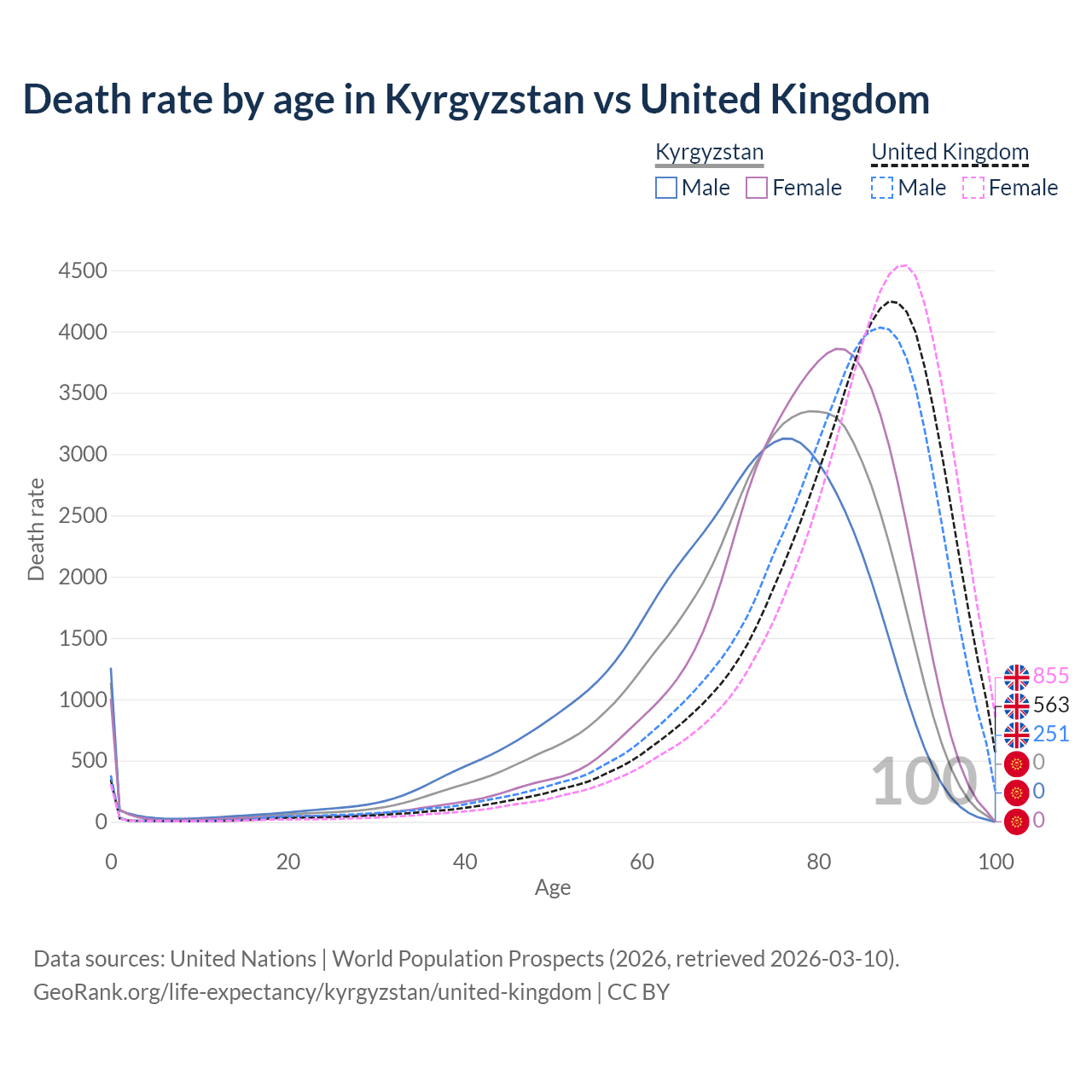 In Kyrgyzstan, the most common age of death is 79, compared to 88 in the United Kingdom. The median age of death is 75.6 in Kyrgyzstan and 84.9 in the United Kingdom, meaning only half of each cohort is expected to live past that age.