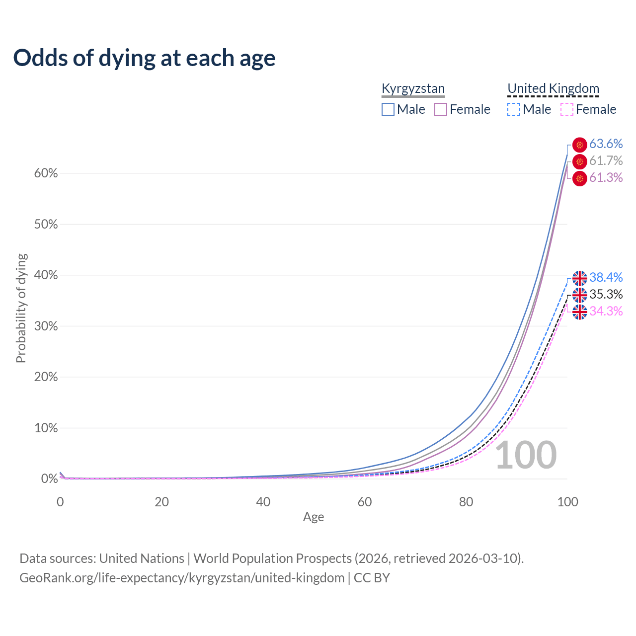 This life expectancy calculator shows the odds of living to 100, 95, 90, and below based on current age for both males and females in Kyrgyzstan and the United Kingdom, along with mean and median age of death. The calculations are based on the 2026 life tables (actuarial tables) from the UN World Population Prospects.
