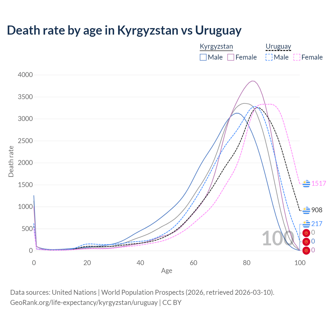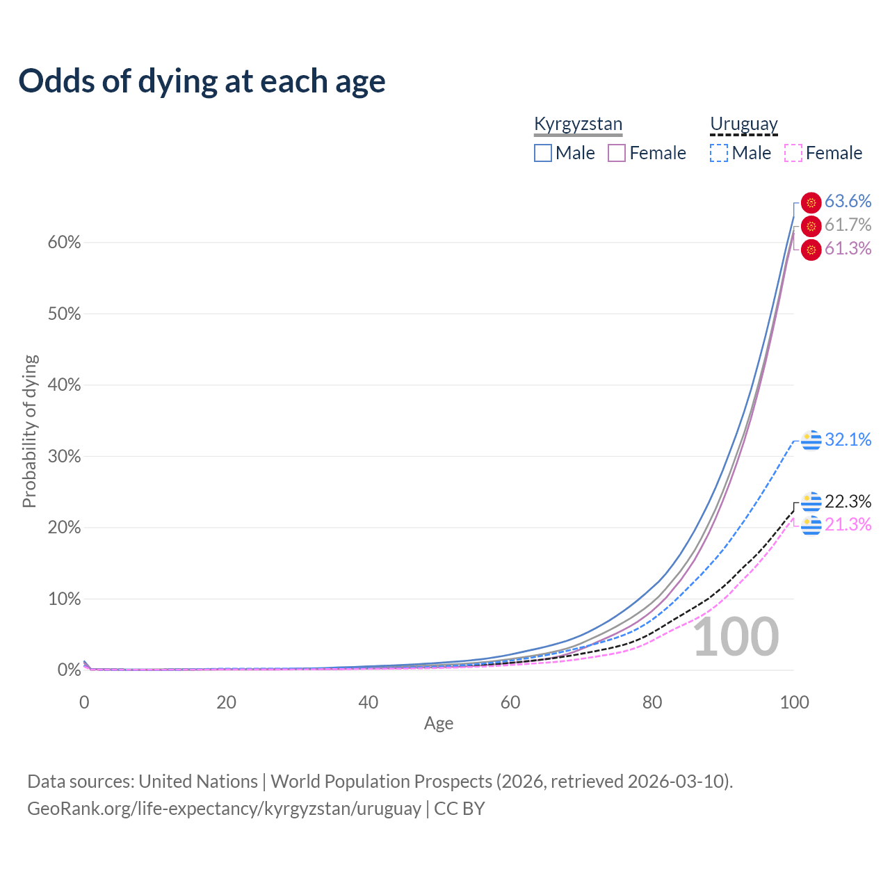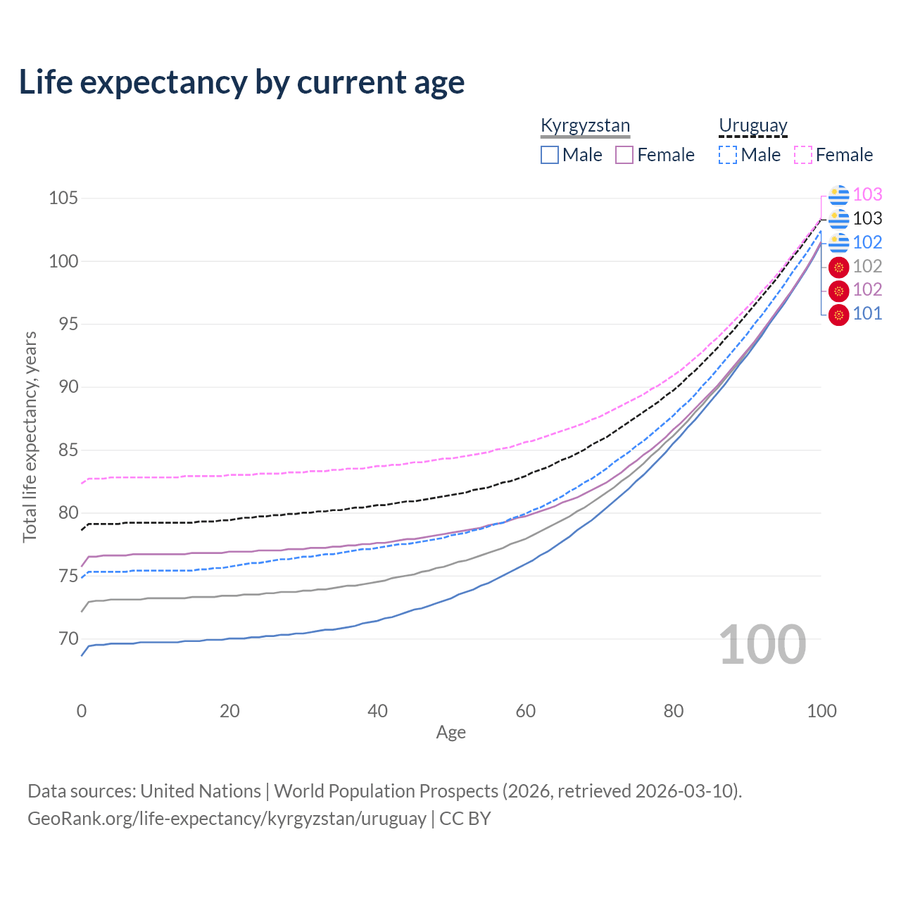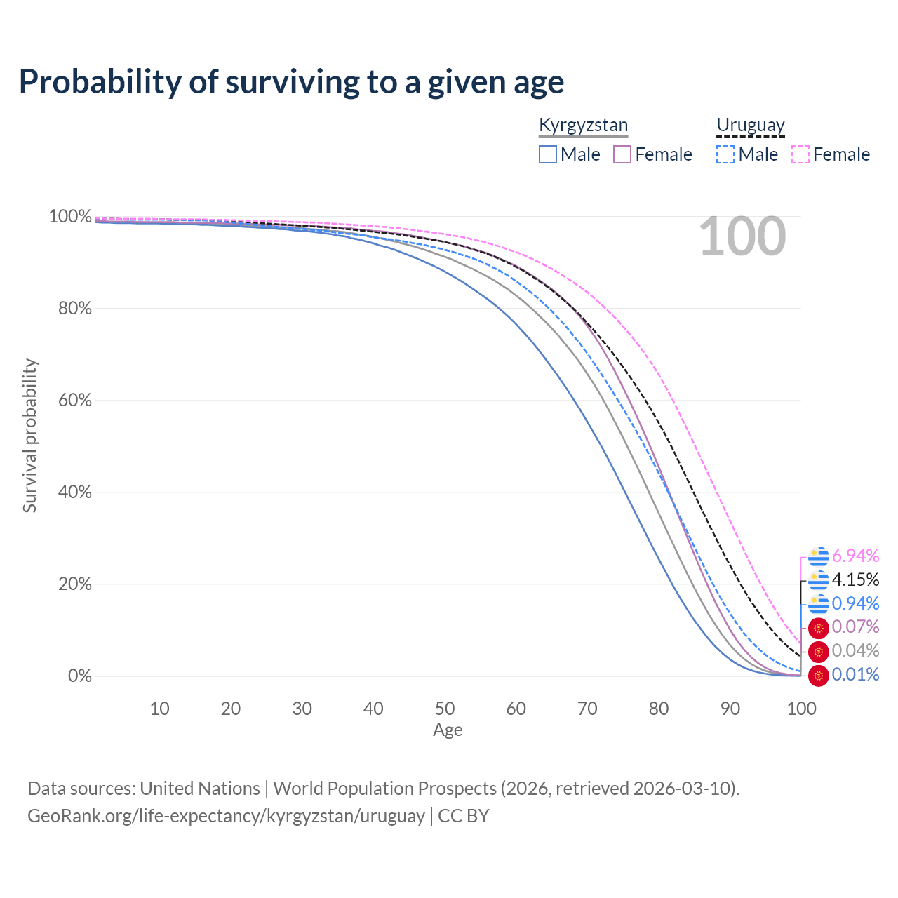 This life expectancy calculator shows the odds of living to 100, 95, 90, and below based on current age for both males and females in Kyrgyzstan and Uruguay, along with mean and median age of death. The calculations are based on the 2026 life tables (actuarial tables) from the UN World Population Prospects.