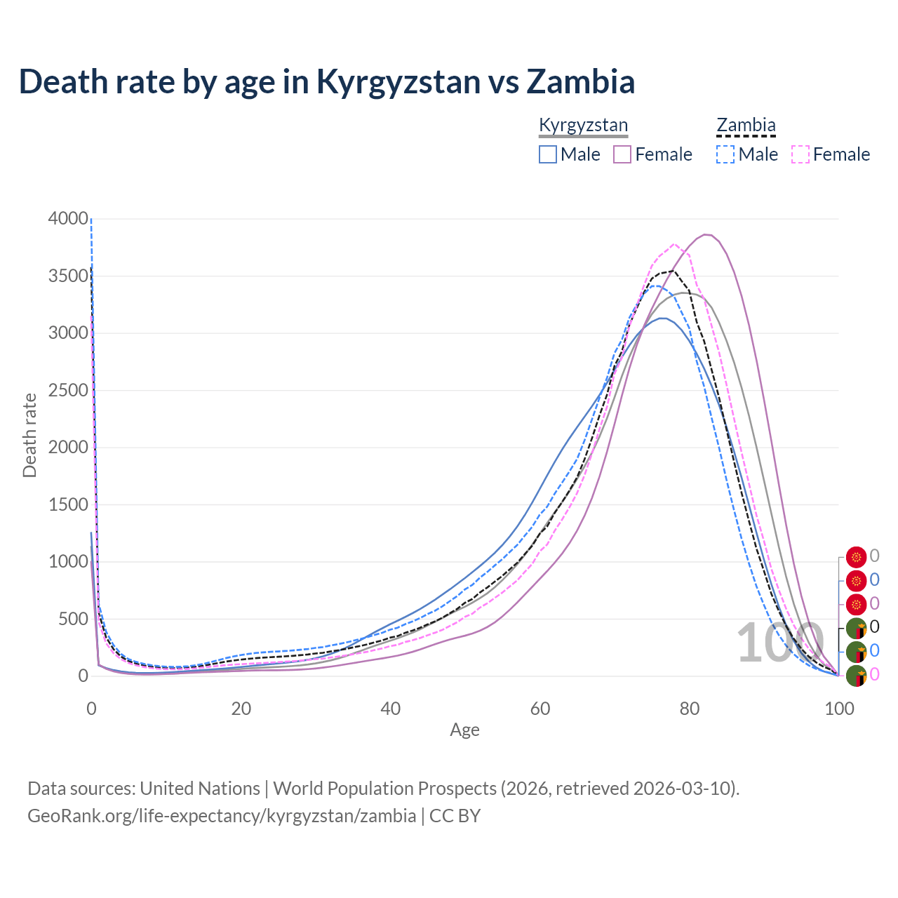 This life expectancy calculator shows the odds of living to 100, 95, 90, and below based on current age for both males and females in Kyrgyzstan and Zambia, along with mean and median age of death. The calculations are based on the 2026 life tables (actuarial tables) from the UN World Population Prospects.