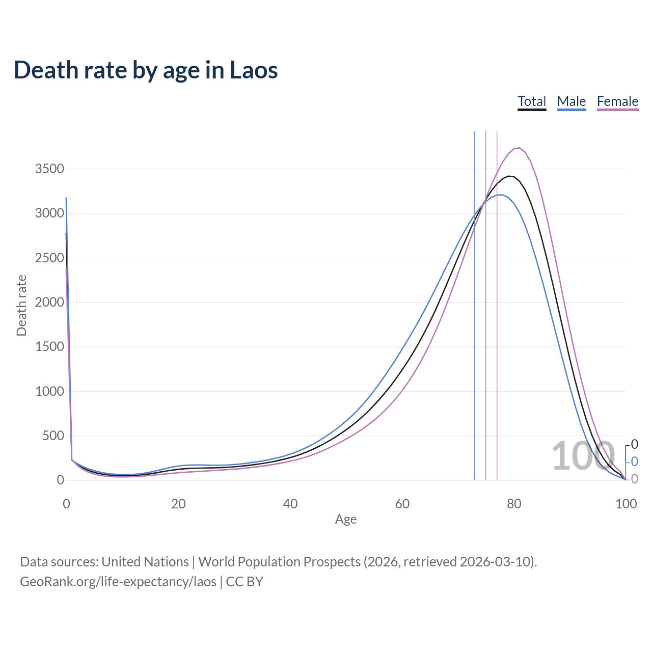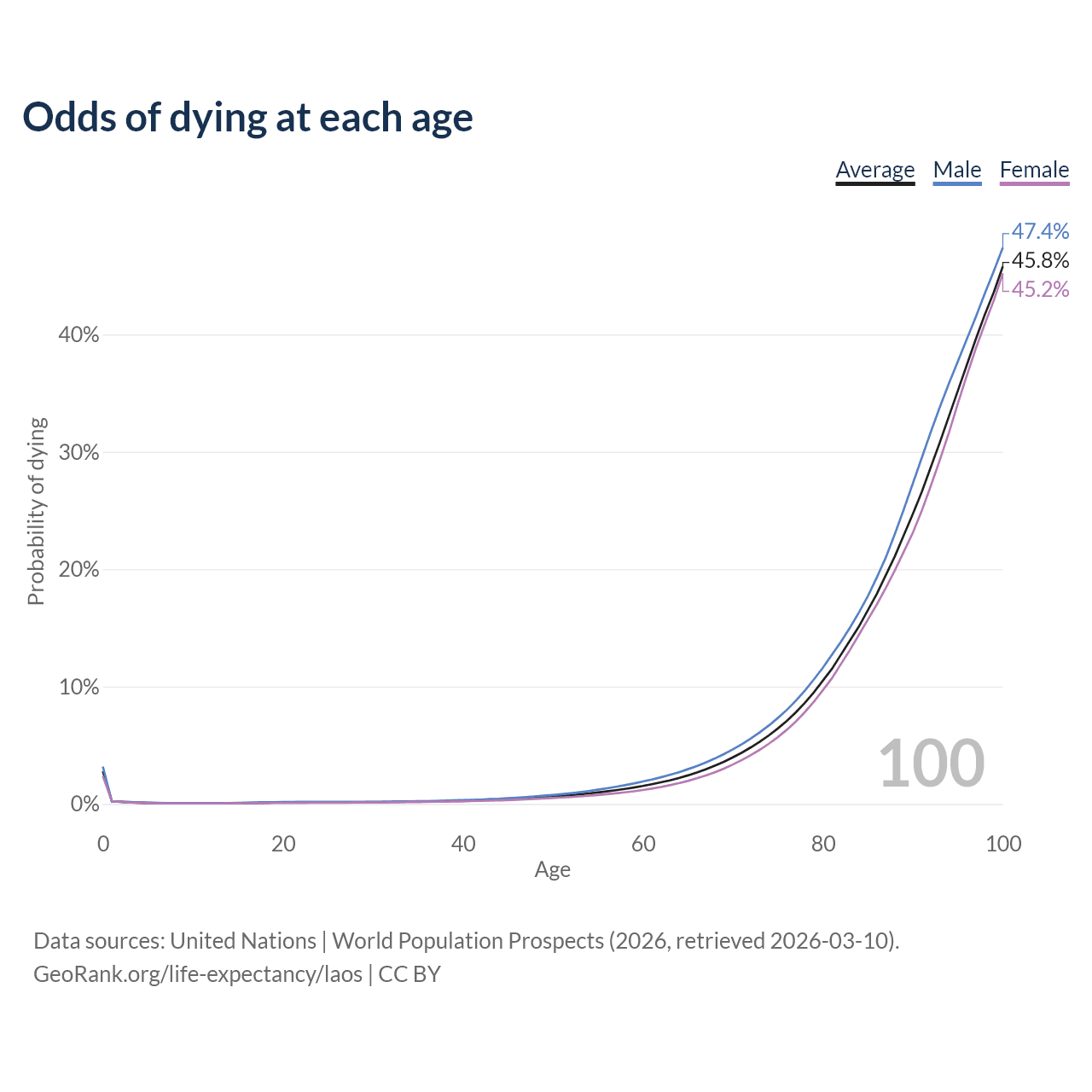 This life expectancy calculator shows the odds of living to 100, 95, 90, and below based on current age for both males and females in Laos, along with mean and median age of death. The calculations are based on the 2026 life tables (actuarial tables) from the UN World Population Prospects.