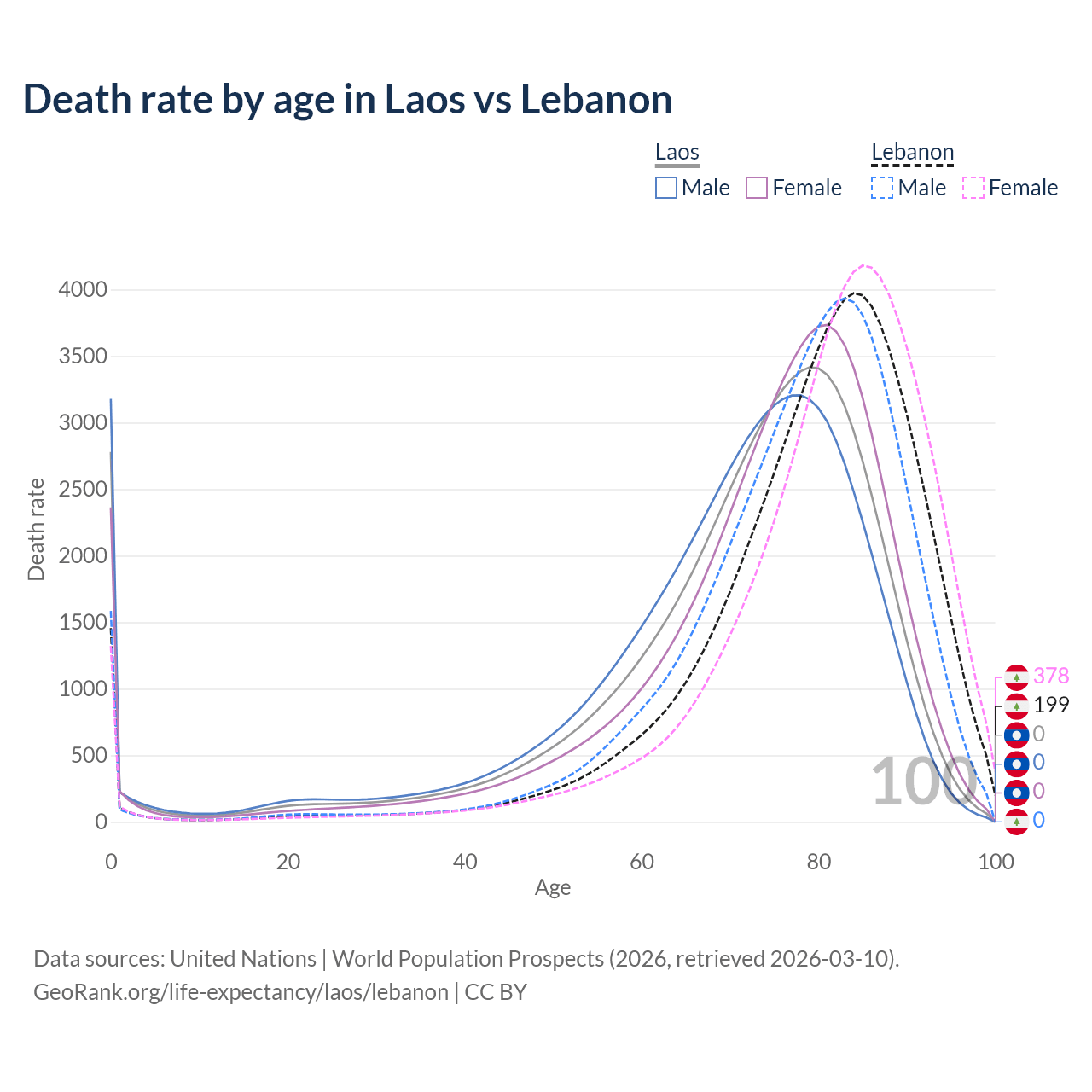 In Laos, the most common age of death is 79, compared to 84 in Lebanon. The median age of death is 74.7 in Laos and 81.6 in Lebanon, meaning only half of each cohort is expected to live past that age.
