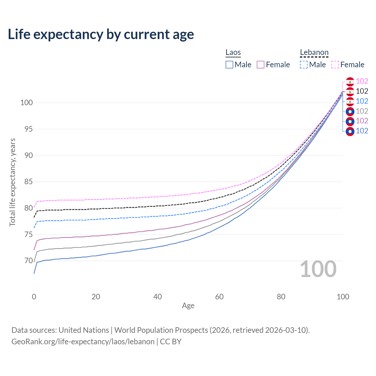 This life expectancy calculator shows the odds of living to 100, 95, 90, and below based on current age for both males and females in Laos and Lebanon, along with mean and median age of death. The calculations are based on the 2026 life tables (actuarial tables) from the UN World Population Prospects.
