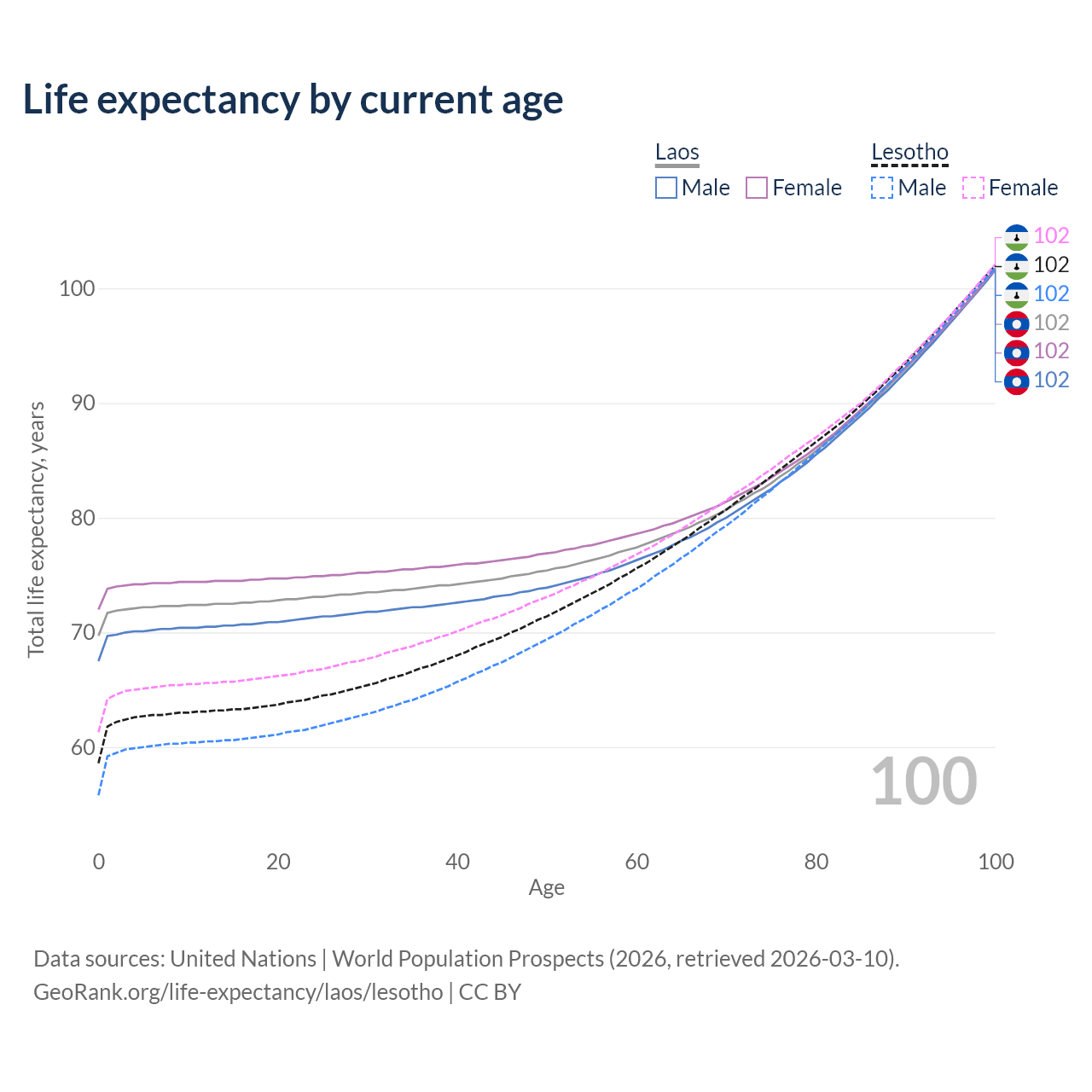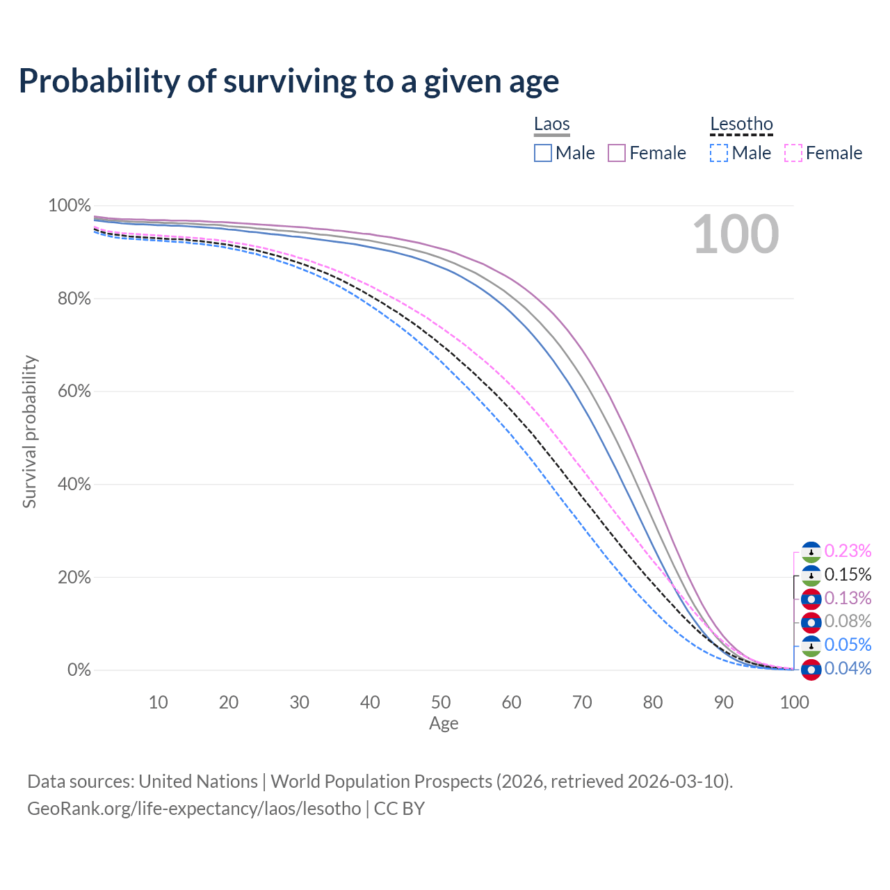 This life expectancy calculator shows the odds of living to 100, 95, 90, and below based on current age for both males and females in Laos and Lesotho, along with mean and median age of death. The calculations are based on the 2026 life tables (actuarial tables) from the UN World Population Prospects.