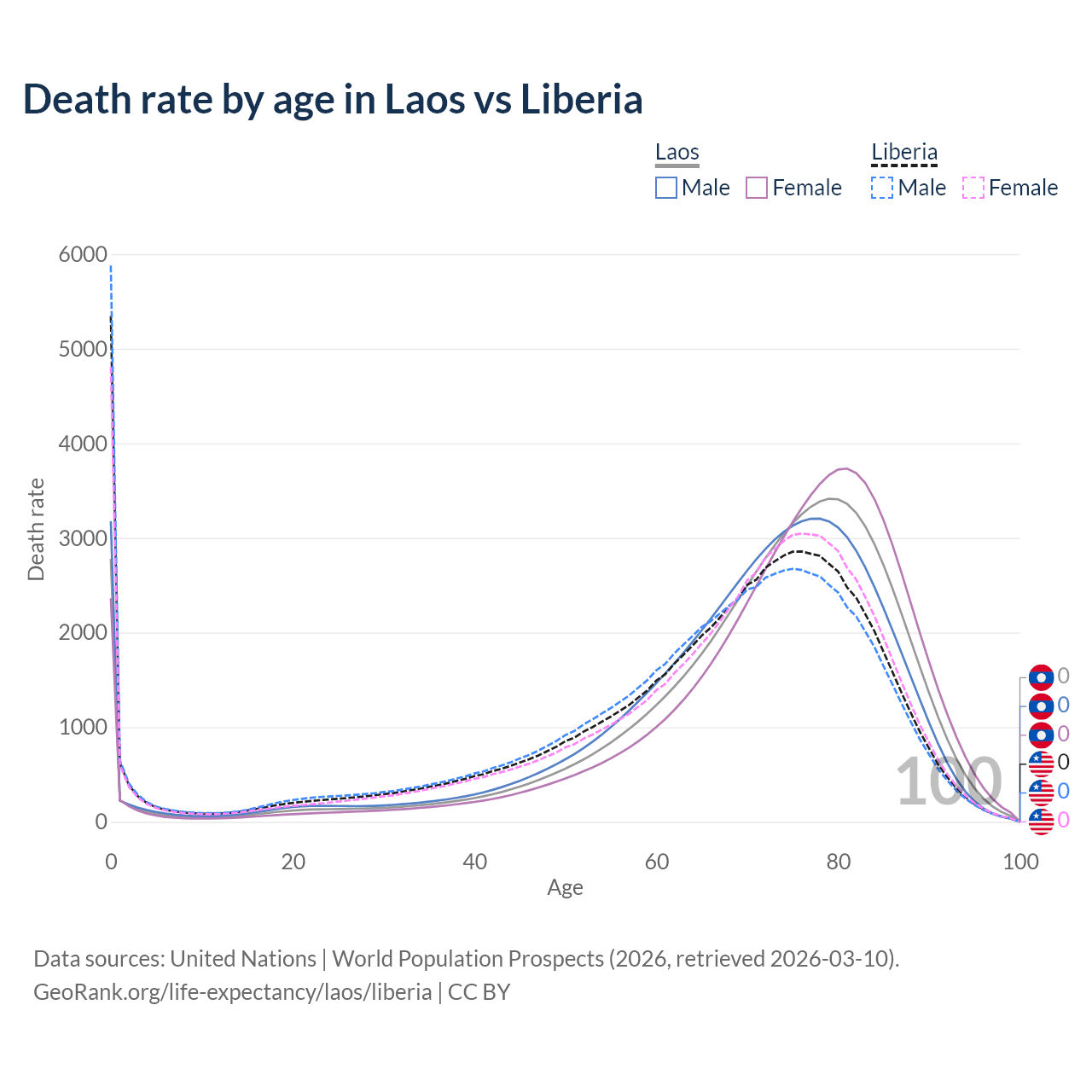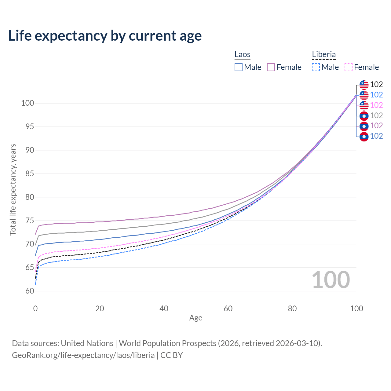 This life expectancy calculator shows the odds of living to 100, 95, 90, and below based on current age for both males and females in Laos and Liberia, along with mean and median age of death. The calculations are based on the 2026 life tables (actuarial tables) from the UN World Population Prospects.