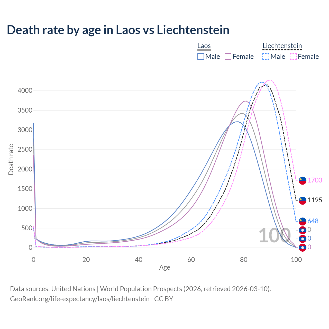 This life expectancy calculator shows the odds of living to 100, 95, 90, and below based on current age for both males and females in Laos and Liechtenstein, along with mean and median age of death. The calculations are based on the 2026 life tables (actuarial tables) from the UN World Population Prospects.