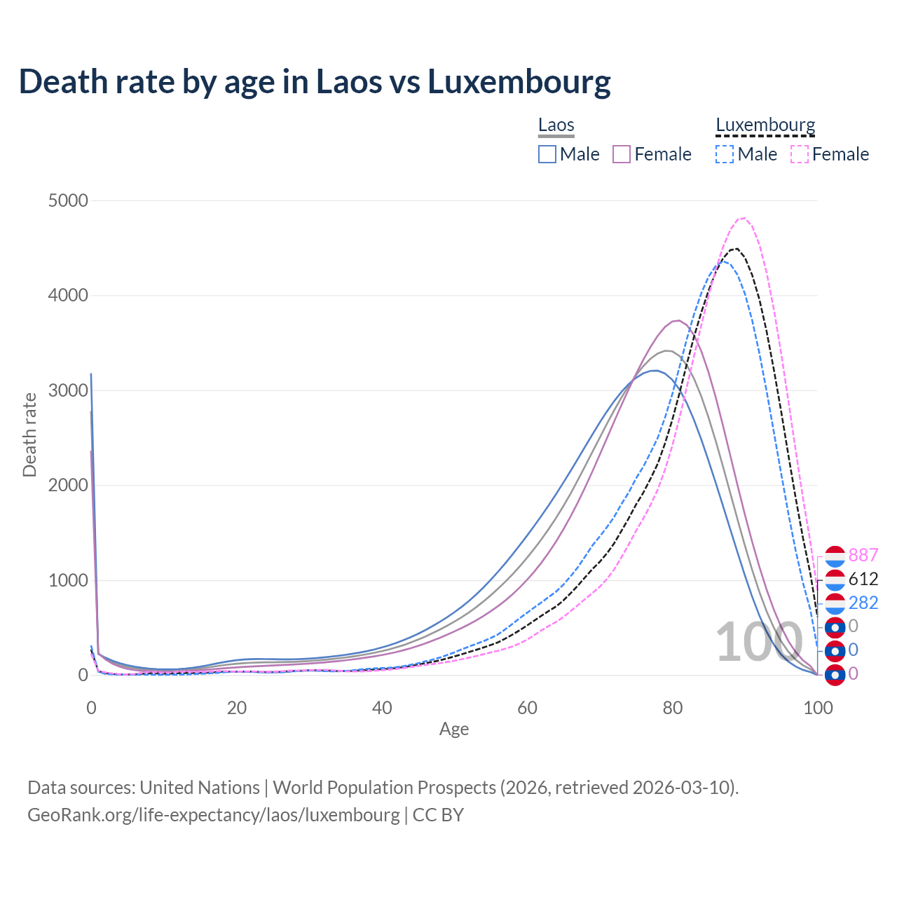 This life expectancy calculator shows the odds of living to 100, 95, 90, and below based on current age for both males and females in Laos and Luxembourg, along with mean and median age of death. The calculations are based on the 2026 life tables (actuarial tables) from the UN World Population Prospects.