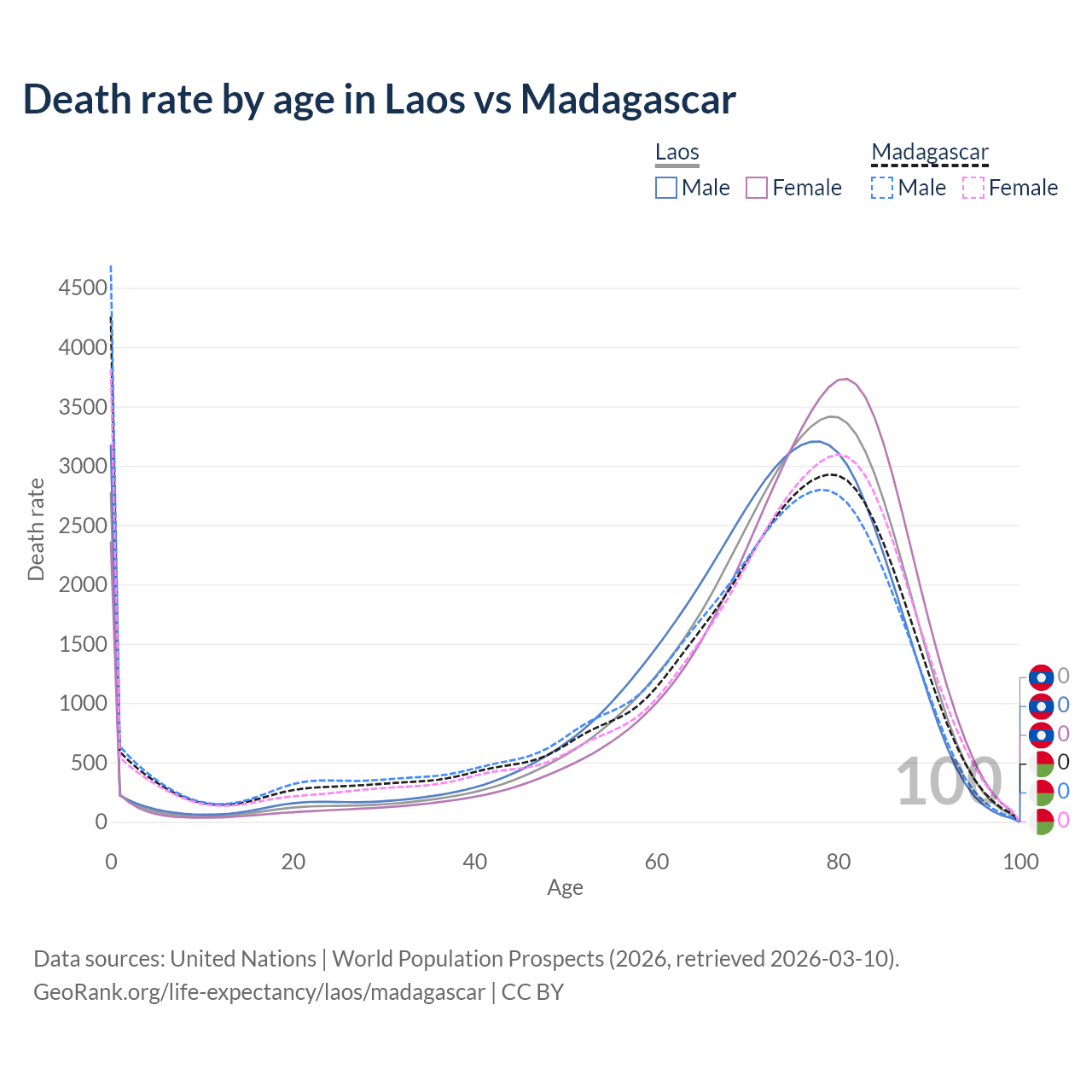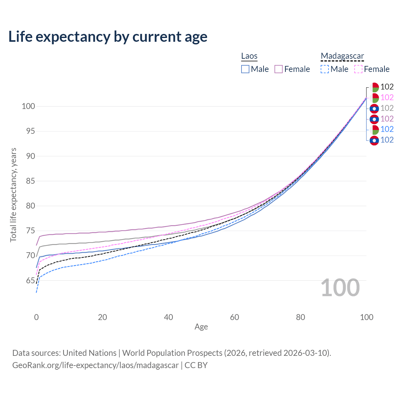 This life expectancy calculator shows the odds of living to 100, 95, 90, and below based on current age for both males and females in Laos and Madagascar, along with mean and median age of death. The calculations are based on the 2026 life tables (actuarial tables) from the UN World Population Prospects.