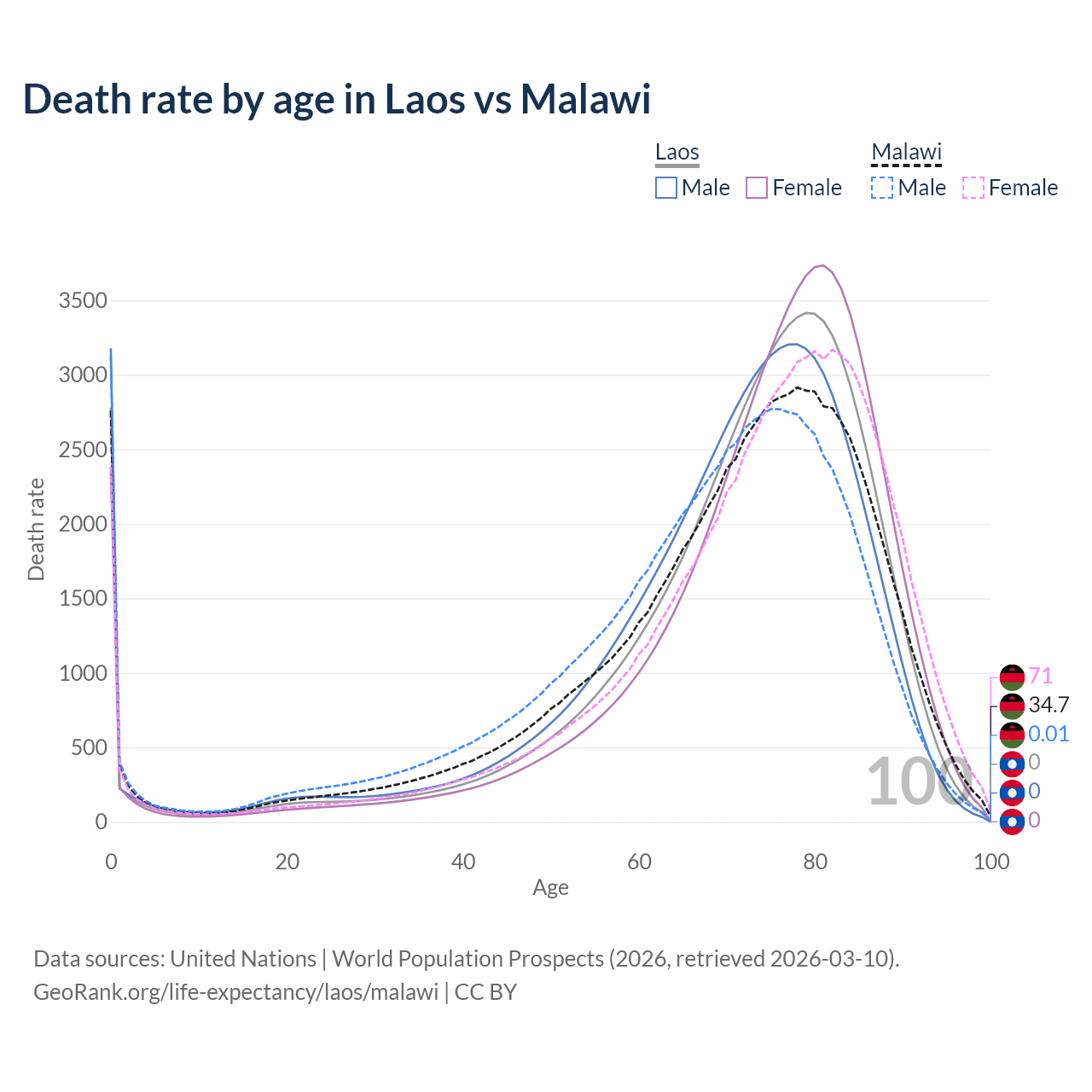 The average life expectancy at birth is 69.7 years in Laos vs 67.9 in Malawi. Laos is ranked 139/197 by life expectancy, and Malawi is 152/197. In Laos, the life expectancy is 67.5 years for males and 72 years for females. In Malawi, it's 64.6 years for males and 71.1 years for females.
