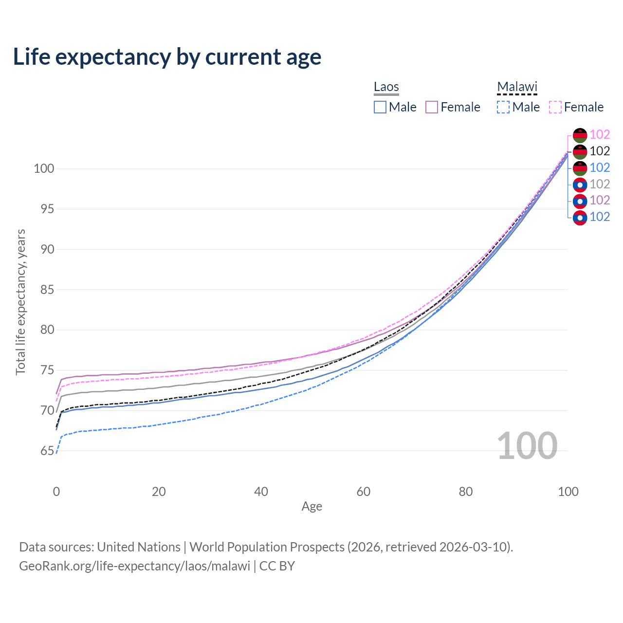 This life expectancy calculator shows the odds of living to 100, 95, 90, and below based on current age for both males and females in Laos and Malawi, along with mean and median age of death. The calculations are based on the 2026 life tables (actuarial tables) from the UN World Population Prospects.