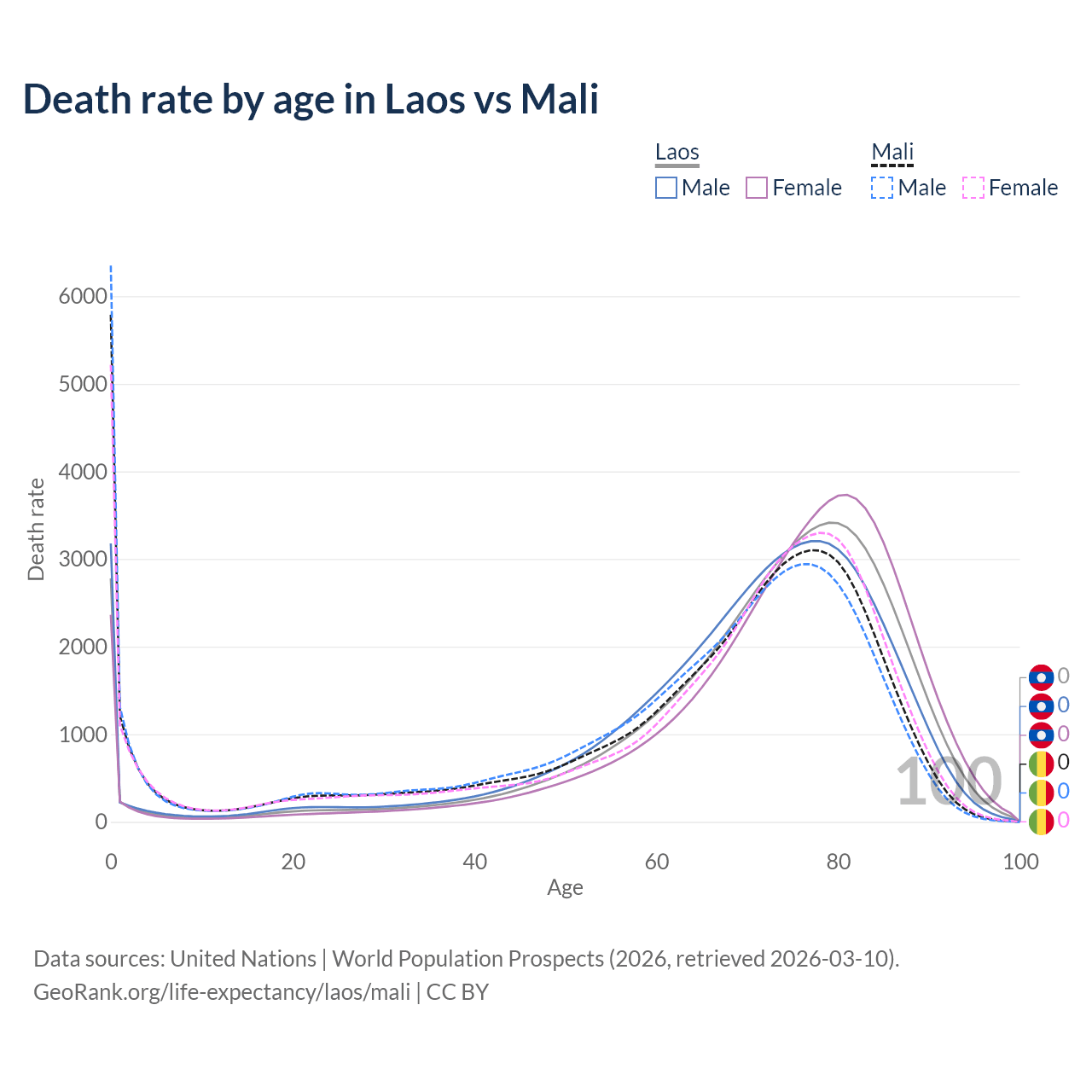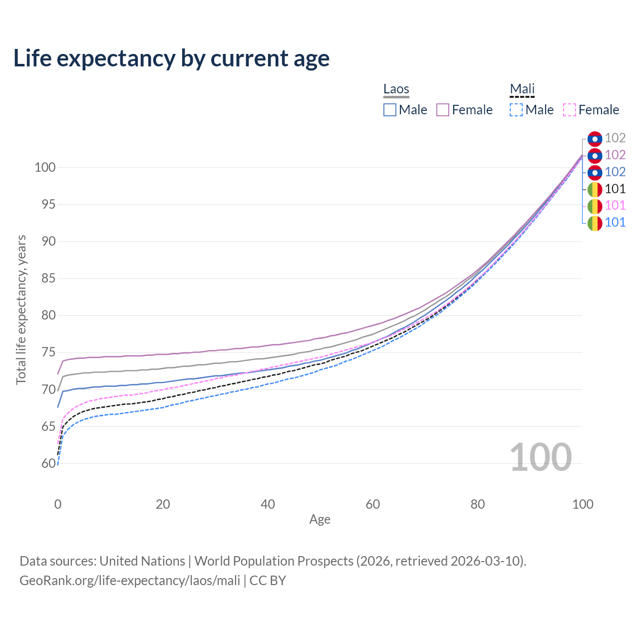 This life expectancy calculator shows the odds of living to 100, 95, 90, and below based on current age for both males and females in Laos and Mali, along with mean and median age of death. The calculations are based on the 2026 life tables (actuarial tables) from the UN World Population Prospects.