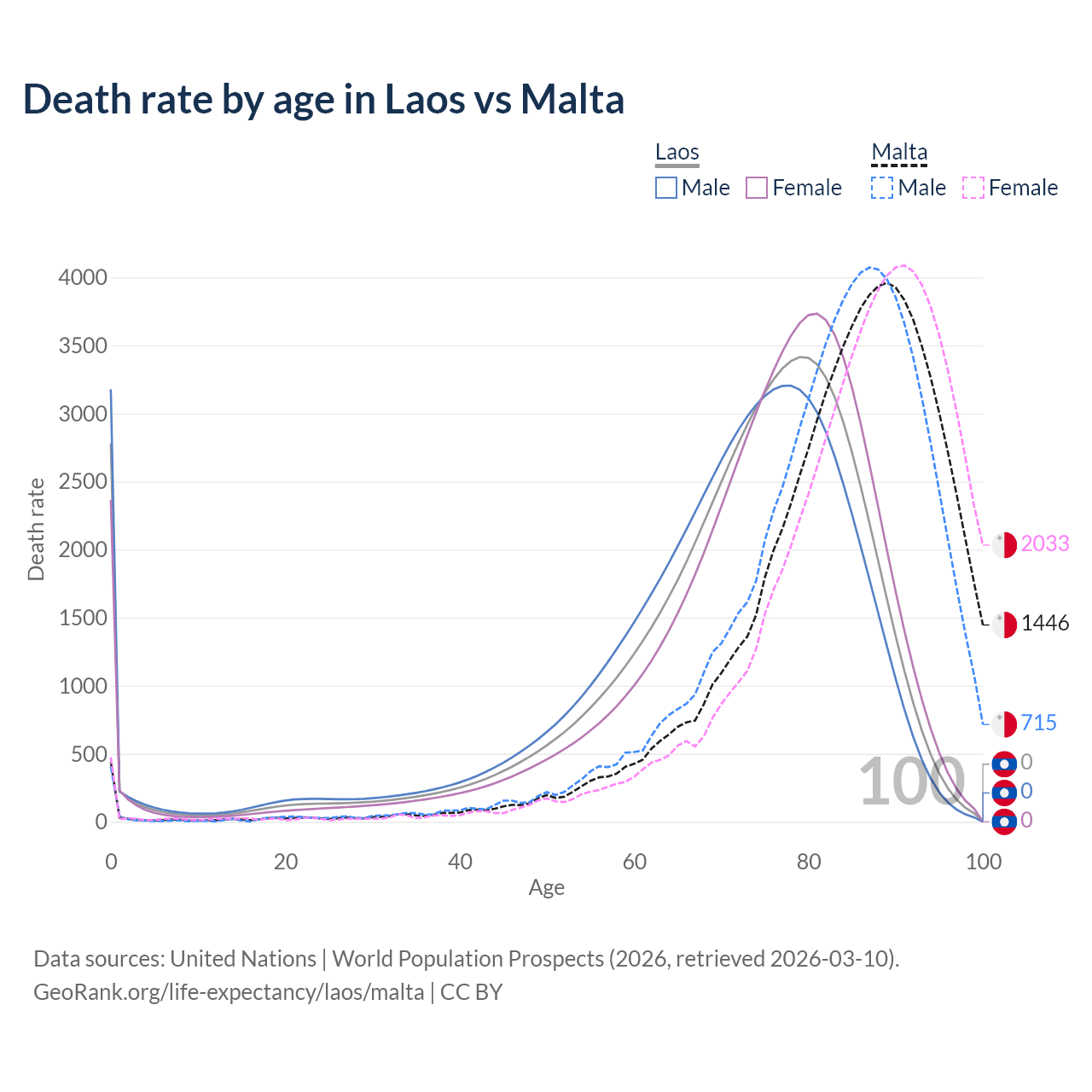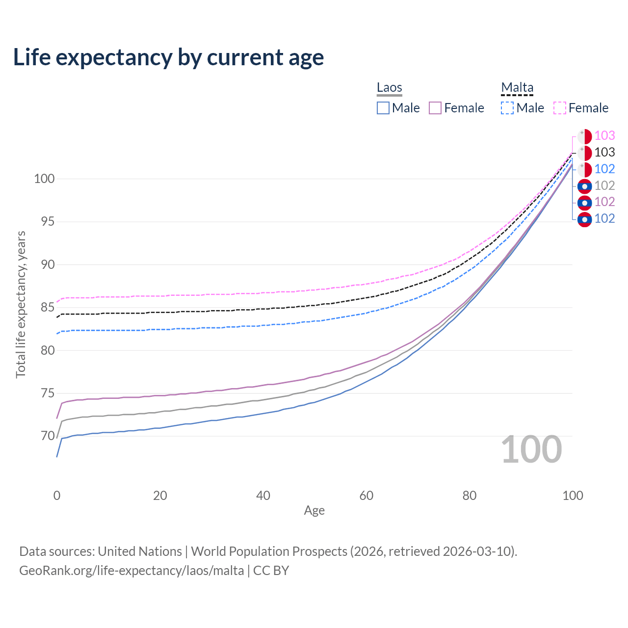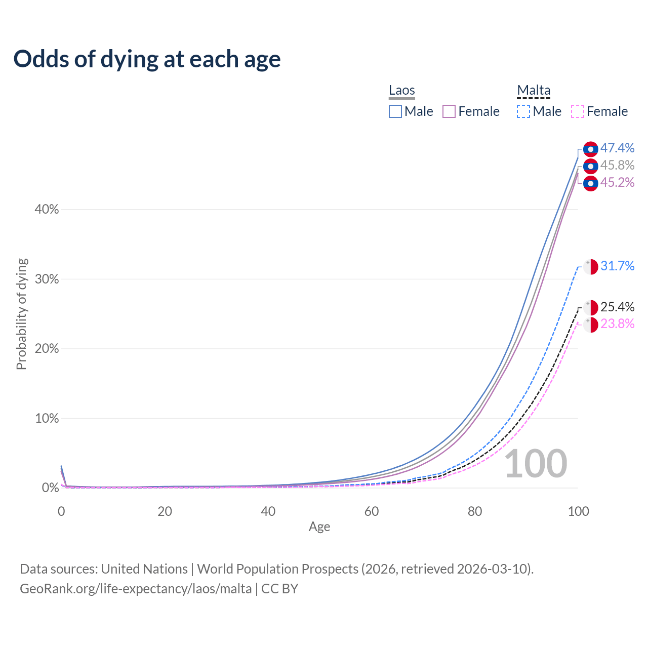 This life expectancy calculator shows the odds of living to 100, 95, 90, and below based on current age for both males and females in Laos and Malta, along with mean and median age of death. The calculations are based on the 2026 life tables (actuarial tables) from the UN World Population Prospects.
